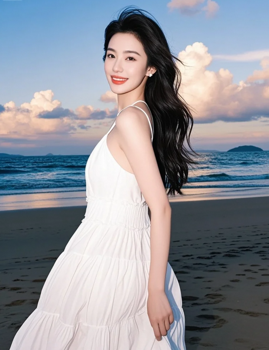 夕阳熔金,裙裾如焰,她是海岸线上最亮的星