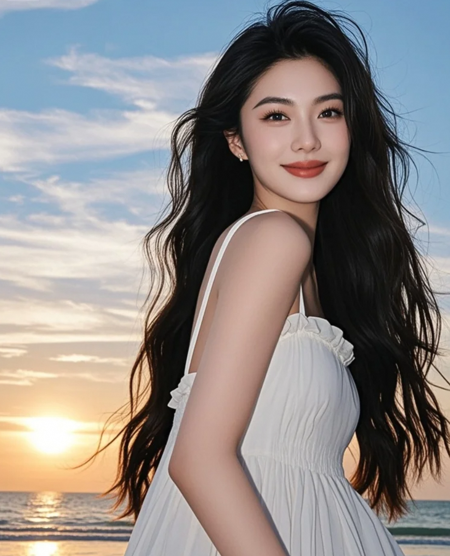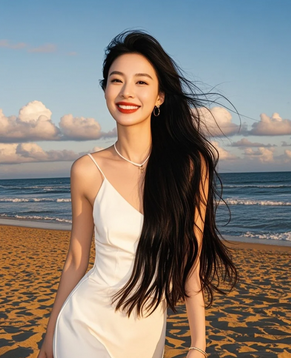 夕阳熔金,裙裾如焰,她是海岸线上最亮的星