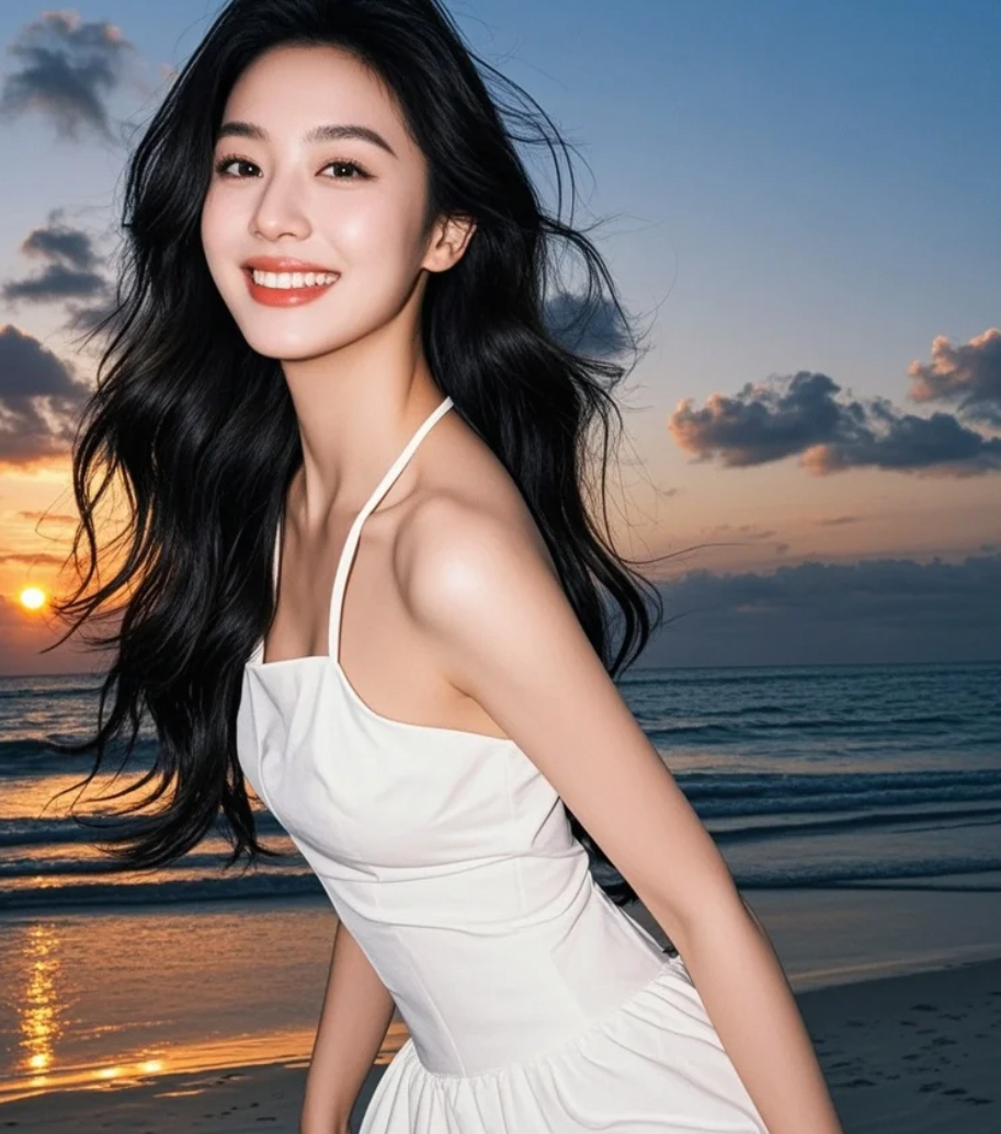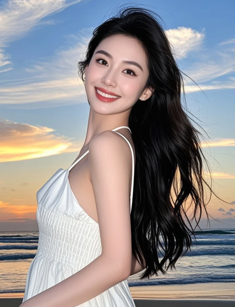 海浪低语,裙角飞扬,她与暮色融为一体