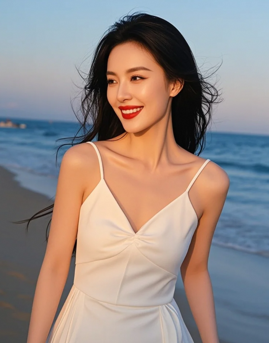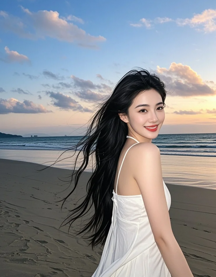 裙角与浪花共舞,谱写着黄昏的圆舞曲