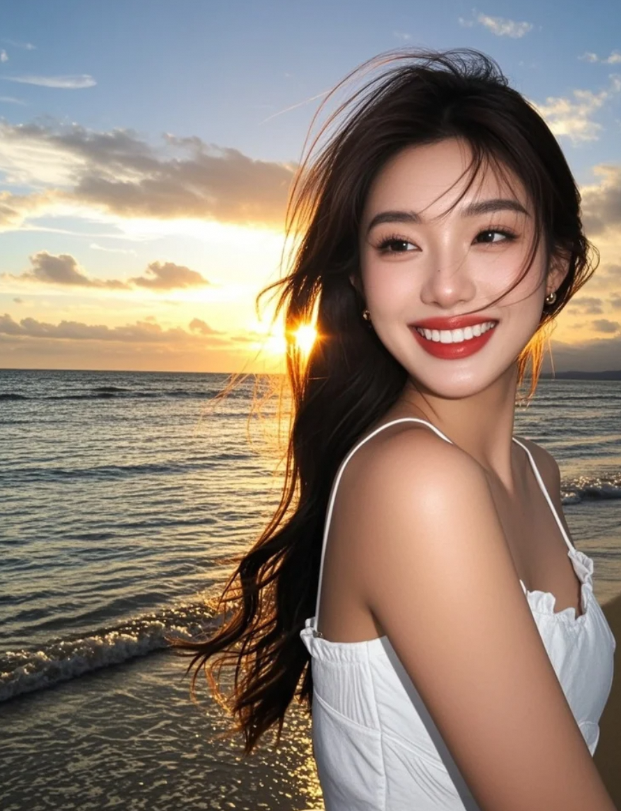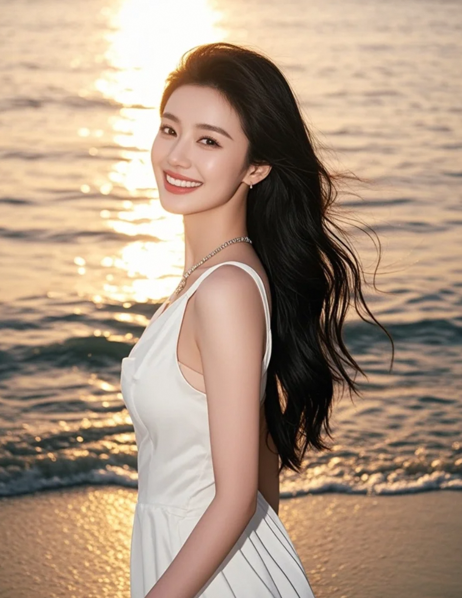 裙角与浪花共舞,谱写着黄昏的圆舞曲