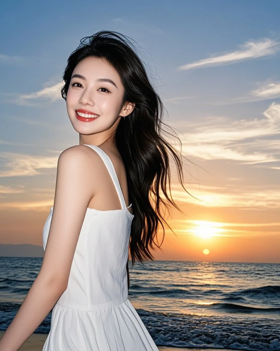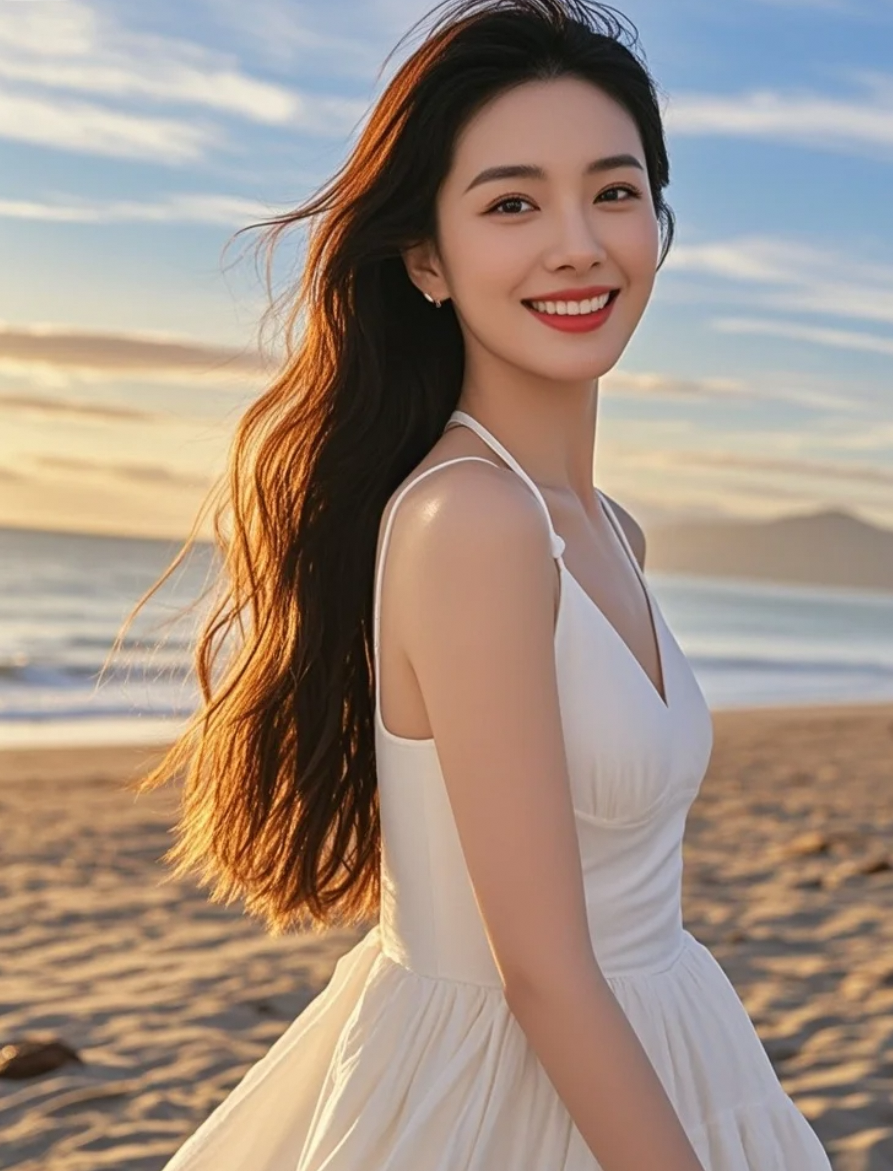 裙角与浪花共舞,谱写着黄昏的圆舞曲