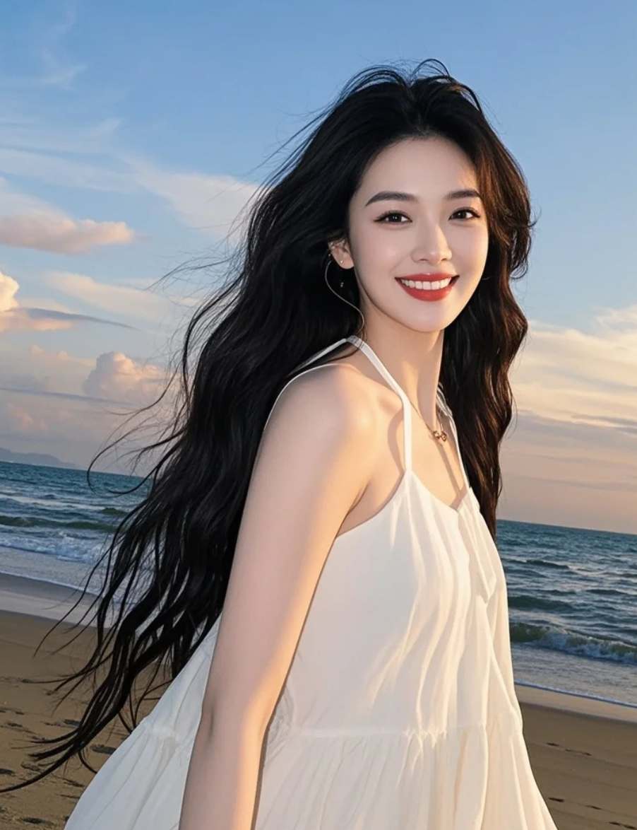 裙角与浪花共舞,谱写着黄昏的圆舞曲