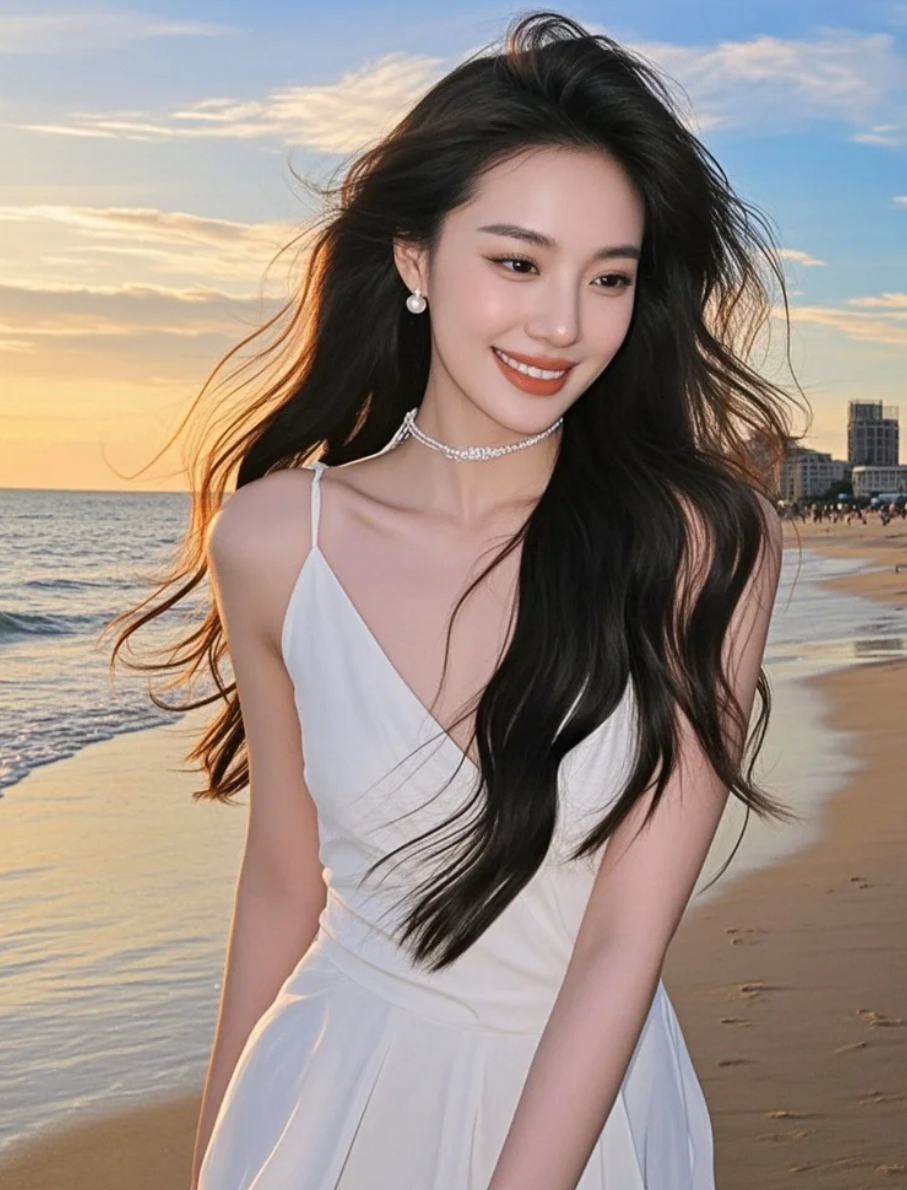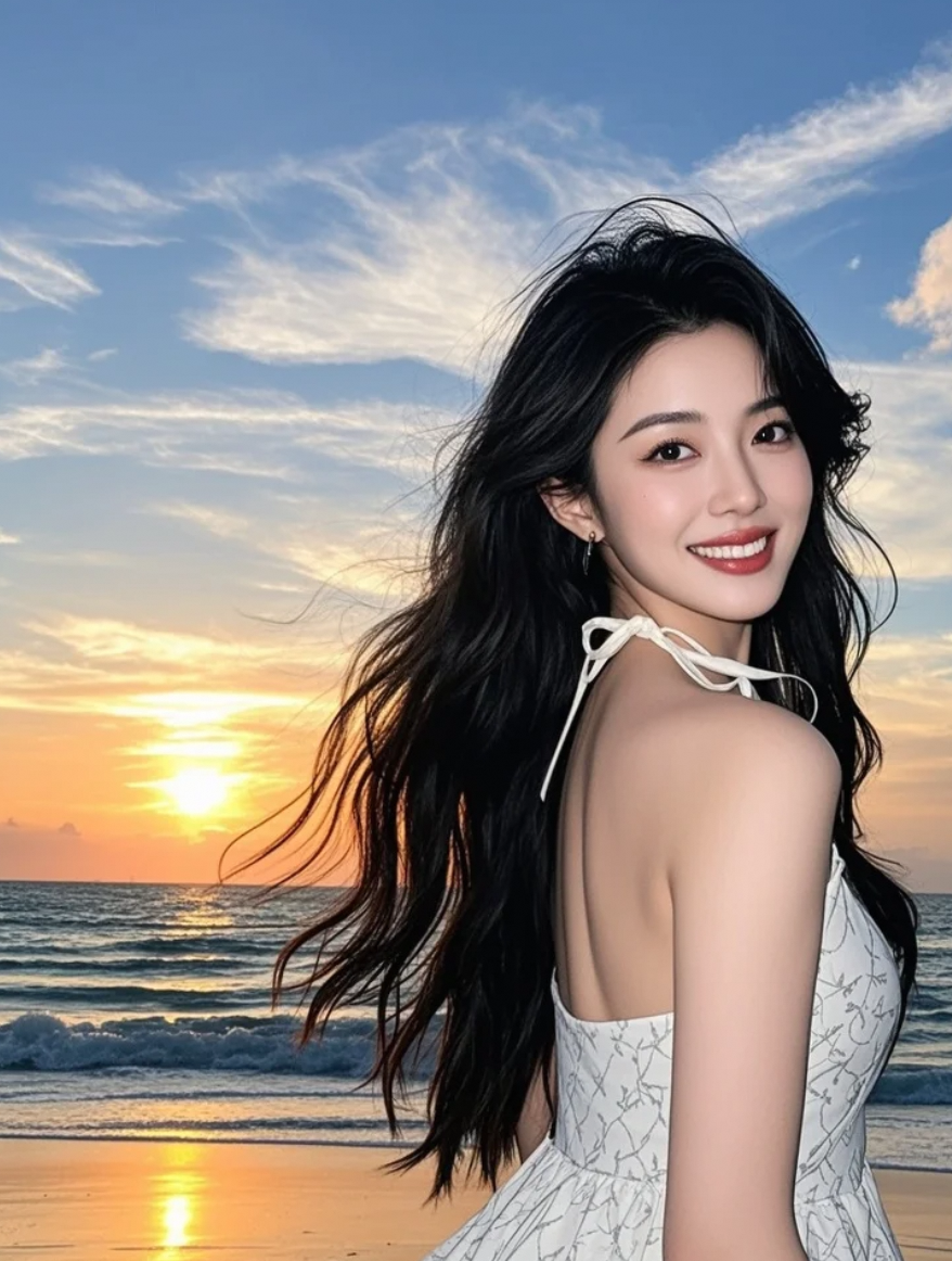 裙角与浪花共舞,谱写着黄昏的圆舞曲