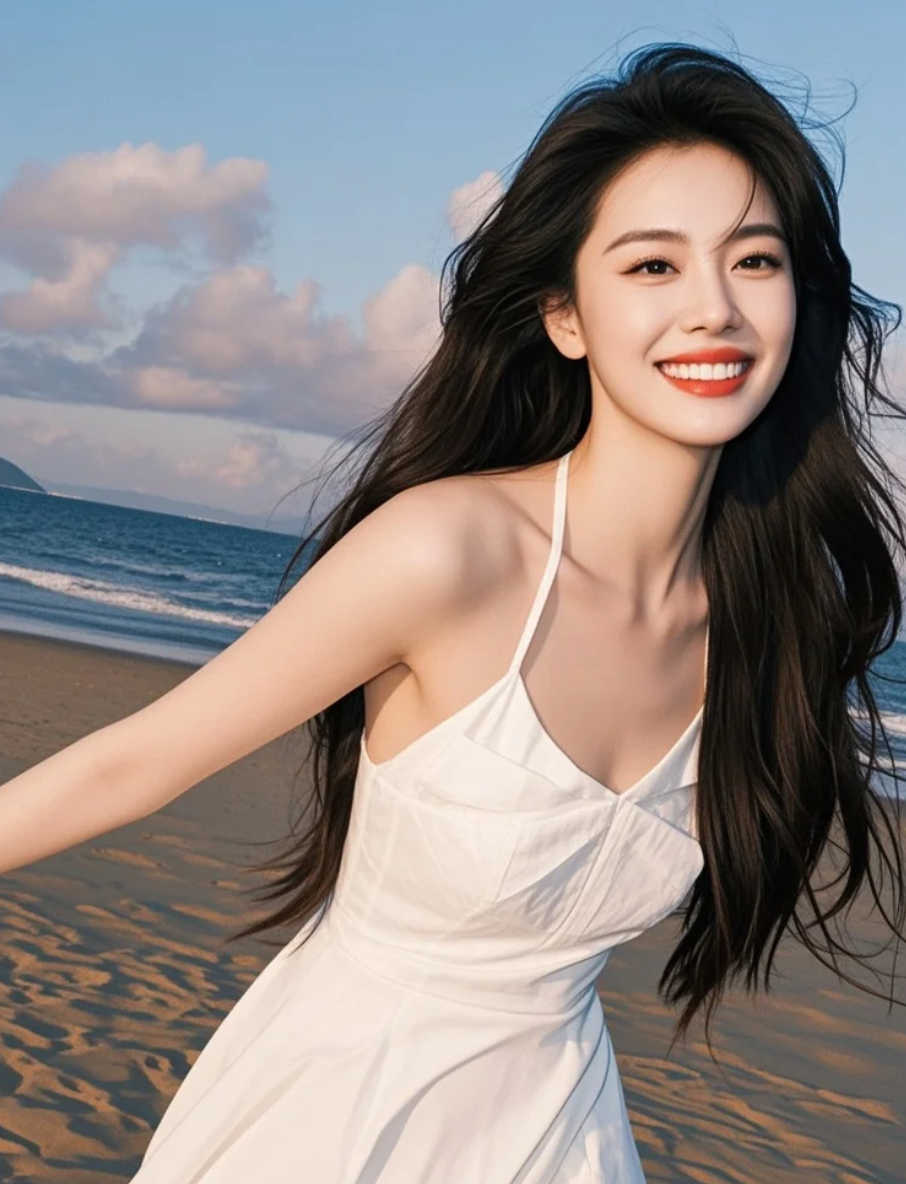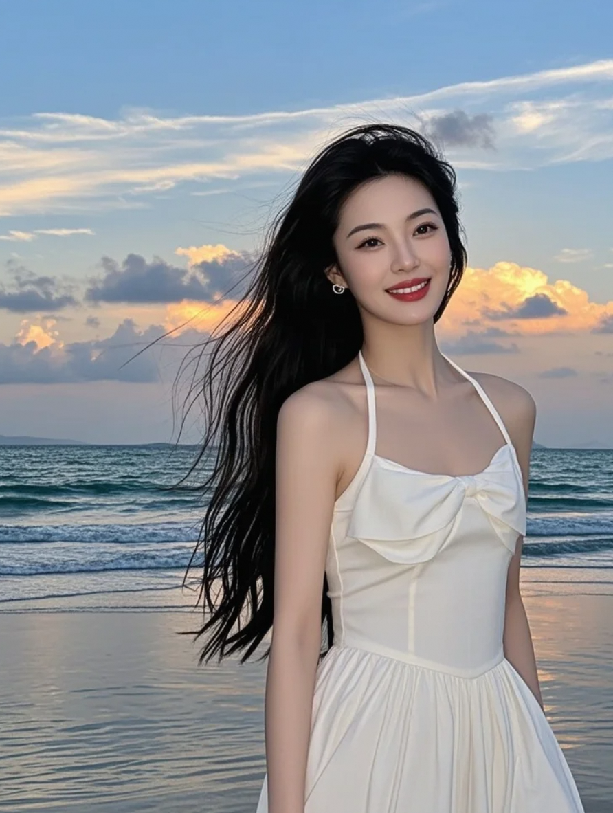 裙角与浪花共舞,谱写着黄昏的圆舞曲
