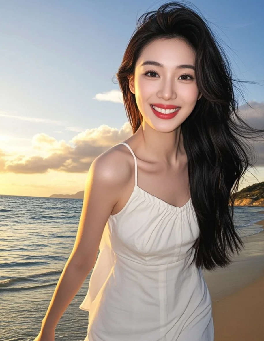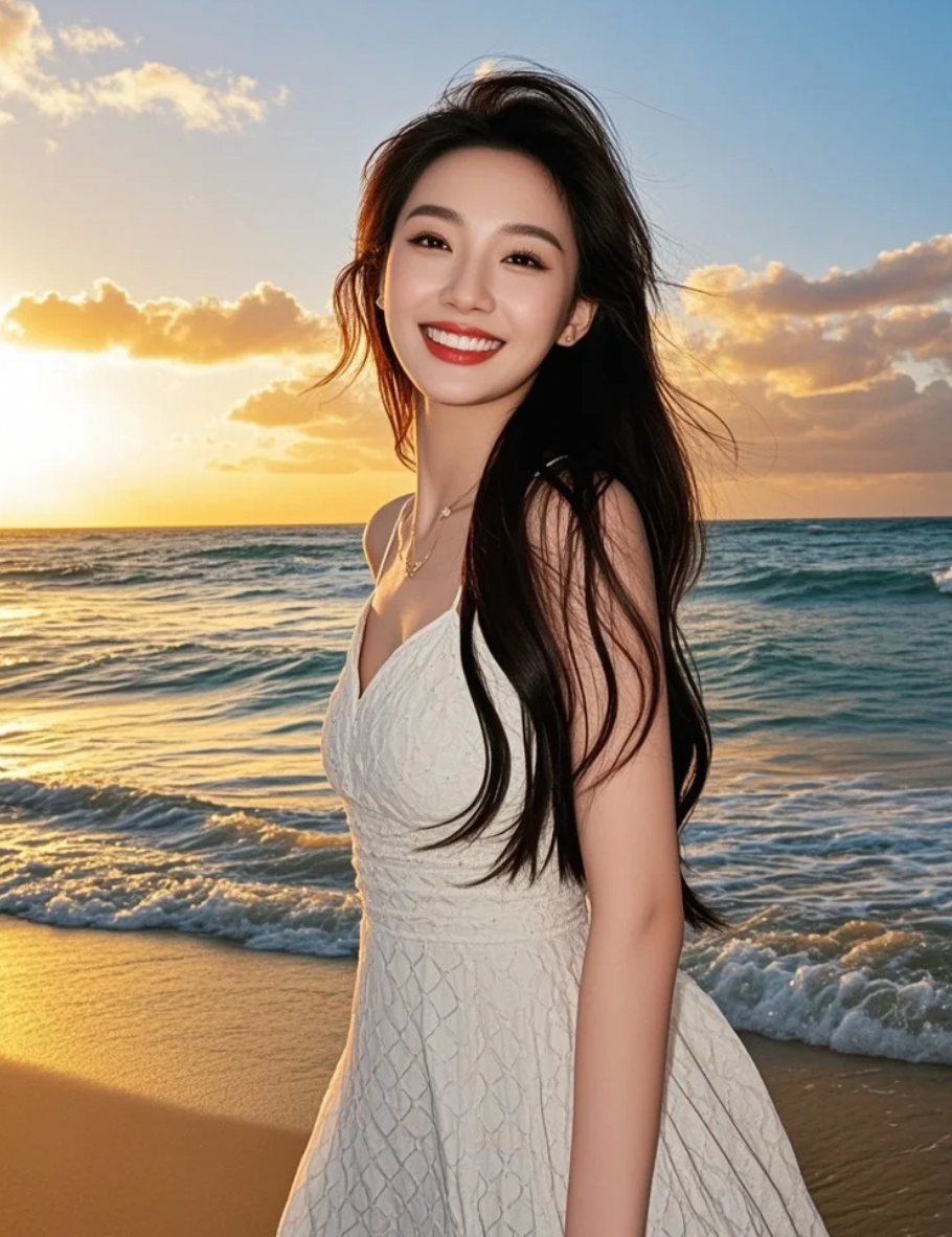 裙角与浪花共舞,谱写着黄昏的圆舞曲