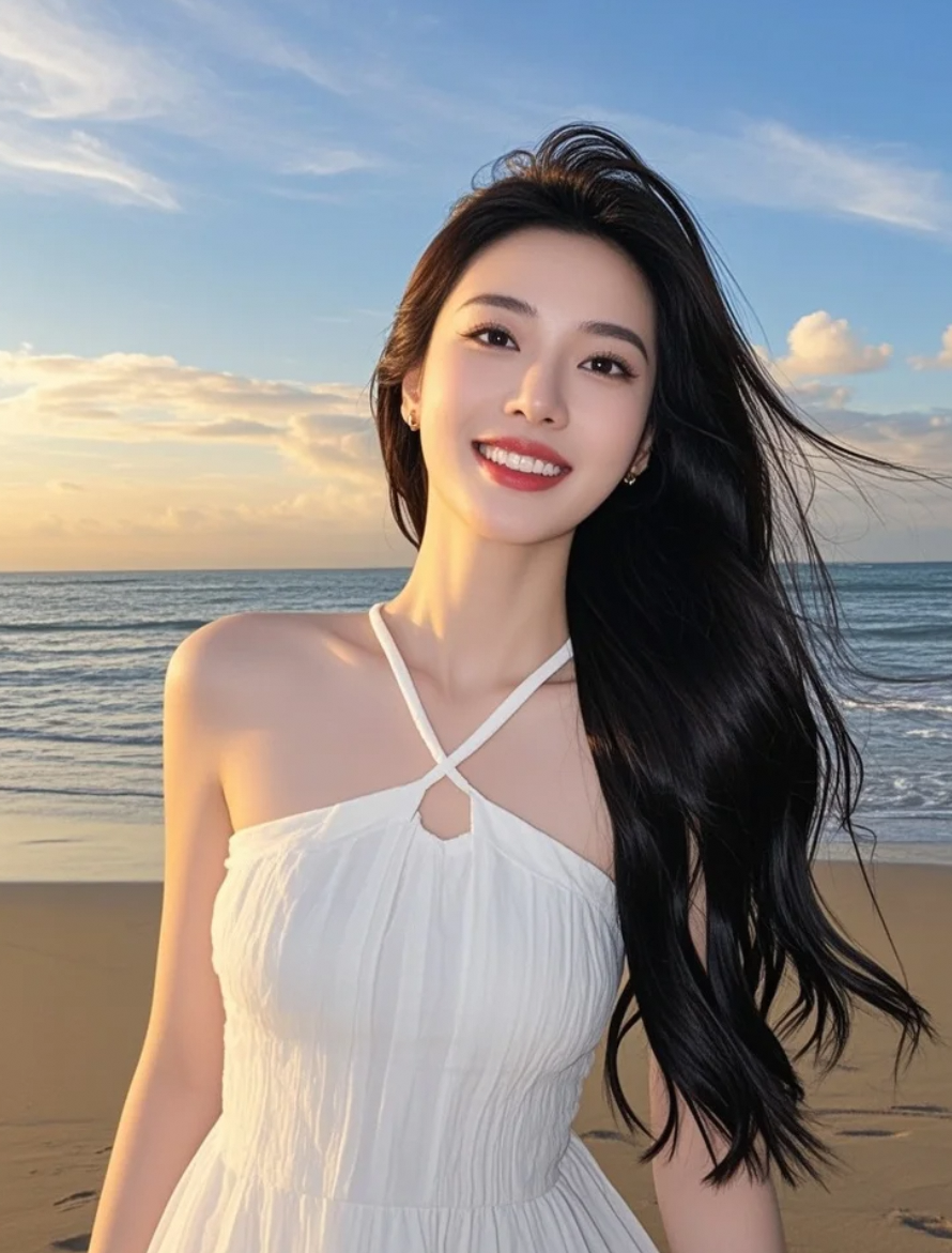 裙角与浪花共舞,谱写着黄昏的圆舞曲