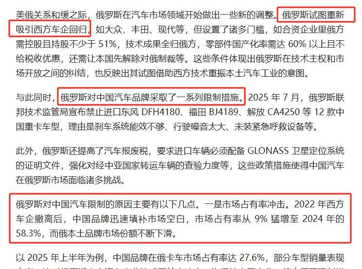 现在中美俄大三角之间,美国没了压倒性优势后,中俄也不可能是铁板一块! 就拿最近俄罗斯汽车市场来说,真是让人跌破眼镜!按理说,中国汽车在俄罗斯卖得好,那叫兄弟帮忙,互通有无。 可俄罗斯这边却突然给中国车企来了个“下马威”:重型卡车刹车能效不够,噪音太大,没装紧急呼叫设备,通通不让进口。 紧接着又来一刀,大幅提高汽车报废税,还强制要求安装他们自己的定位系统,甚至连从中亚转运的中国车,也得挨个“盘问”清楚。 这波操作,要放以前,我们可能觉得有点费解,甚至会想:这哥俩关系不是挺好的吗?怎么俄罗斯突然对自己人“下狠手”了? 其实,这背后藏着俄罗斯一个天大的“苦衷”,甚至可以说,是一个国家为了“活下去”的本能反应。咱们想想,汽车工业这玩意儿,可不是简单的造几辆车。它上连钢铁、化工,下接零部件、维修保养,是个巨大的工业体系。 俄罗斯的工业底子说实话一直就不太行,能拿得出手的工业品不多,这些年又被西方制裁得够呛,很多产业都快“熄火”了。 你想啊,如果这时候,物美价廉、种类繁多的中国汽车,像洪水一样涌入俄罗斯市场,凭着强大的竞争力,哗啦啦就把俄罗斯本来就不多的汽车市场给占光了。那结果会怎样? 俄罗斯自己的汽车工厂,本来就苟延残喘,这下就得彻底关门大吉。跟着汽车相关的那些配套企业,什么零部件厂、轮胎厂,也得跟着倒闭。这可不是小事,这会直接冲垮俄罗斯本就脆弱的工业体系。 一个国家,要是连自己的工业都保不住,那就真是没底气了。工业是经济的脊梁,是就业的饭碗,更是国家安全的压舱石。想想看,如果连最基本的工业品都得靠别人,一旦被掐脖子,那简直是寸步难行。 所以,俄罗斯对中国汽车“设卡”,真不是针对中国兄弟,而是他们在自救,是在拼命保住自己最后一点“家底”,给未来的工业复兴留个火种。 更有意思的是,俄罗斯一边对中国汽车“设限”,一边又回头去勾搭那些曾经撤离的西方车企。但他们的条件,那叫一个苛刻。 想回来可以,但俄罗斯必须控股,股份还得超过一半。技术成果得全归俄罗斯,零部件国产化率要达到六成以上,而且还没什么税收优惠,甚至还要求西方国家先解除对他们的制裁……这哪是招商引资,简直是“城下之盟”! 但这些看似不近人情的条件,恰恰反映了俄罗斯的困境和决绝。他们既渴望西方先进的技术和管理经验,来给自己汽车工业“续命”,又生怕过度依赖,再次被人卡住脖子。这份患得患失,是对技术主权和产业自主权的极度渴望。 把这些放在中美俄三方关系的大背景下看,就更有意思了。美国虽然不如以前那么“一言九鼎”了,但它依然在全球搅风搅雨,想方设法地围堵中俄。 而中俄出于共同的战略利益,确实在很多国际场合站在一起,共同抵御美国的压力。可一旦涉及到各自国家的“核心利益”,特别是经济利益,尤其是那些关乎国家生存和发展的“命脉”产业,即便是“兄弟”,也会立刻把自己的利益摆在第一位。 所以,俄罗斯对中国汽车的限制,不是说中俄关系“崩了”,而是让我们看到了大国关系的真实底色:合作是主流,但竞争和博弈也无处不在。国家之间的关系,归根结底还是国家利益的博弈。在全球化背景下,每个国家都在努力平衡“开放合作”和“保护自身产业安全”这两件事。 未来的世界,只会越来越复杂。美国还会继续想方设法维持霸权,但它的影响力肯定会越来越受限。而对我们中国来说,面对俄罗斯的这种政策调整,我们不该抱怨,更应该看到机会。 我们自己的汽车产业,是不是该更努力地往高端走,在技术和品质上,做到无可挑剔,真正实现“走遍天下都不怕”?同时也要在其他领域,继续深化与俄罗斯的合作,找到更多的共同点。毕竟,这个世界,没有永远的敌人,也没有永远的朋友,只有永远的利益。 #MCN双量进阶计划#