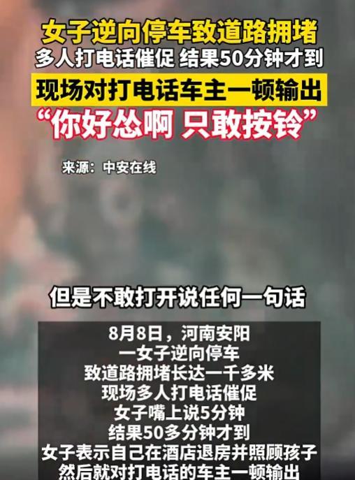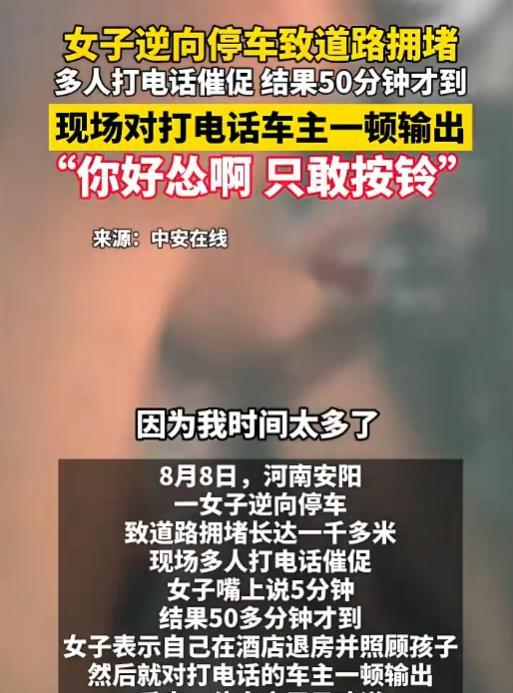 8月8日,河南安阳一女子将私家车,停在非机动车道内后离去。因为路道非常窄,电动车都难以错车,直到一辆路过的私家车驶来,彻底将整条路都堵死,电动车也难以通过。司机一开始只是在车里按着喇叭,半天见没有人来挪车,便下来找电话号码。 打了电话之后,女子说5分钟就到,司机看着身后越堵越长的队伍,难免再次对女司机这个群体腹诽,怎么能在非机动车道上,逆向停车!真是不知道这个驾照是怎么考下来的。可是没有想到5分钟过去了,10分钟过去了,说要来挪车的女子迟迟不见踪影。 后面堵车的多名路人也纷纷给女子打去电话,让赶紧挪车,可是女子只说好好说,根本不见人来。终于50分钟之后,女子才慢慢悠悠的出现了。第一个打电话的大哥看见气不打一处来,就一直按喇叭宣泄自己的情绪。不料,女子却被这一行为惹恼了。 直接将火再次一熄,下了车就冲着大哥的车来了。然后就敲车窗开始骂:“催催催,催什么催?”大哥一看这是个不讲理的,也不想搭理,连车窗也懒得降。 眼看现场的气氛剑拔弩张,被女子堵着的众多路人就开始跟女子喊话“差不多得了!”“赶紧挪车吧!”女子原本还想再跟男子大战三百回合,可是看太多人讨伐她,她一人难以全部骂个遍。直到另一个打圆场,才让女子满意的离开了,仿佛说:“这不还是我赢?” 女子说她当时逆向停车是为了去酒店办理退房,原本以为非常快,可是孩子又出了岔子,所以才耽误了时间。她不明白自己一个宝妈看孩子这么辛苦,为什么没有一个人能理解自己,现在社会的怨气实在是太大了。 而事情传到网上之后,霸道的女子引起了公愤。女子之所以不被人同情,是因为用自己弱势群体的身份,去理所当然的浪费别人的时间,给他人造成困扰。不管她看孩子在多么辛苦,毕竟这孩子也不是这拥堵1000米的路人的,凭什么要让别人惯着你? 也就是大哥脾气好,换个脾气不好的,这顿打是少不了了。再换一个懂法的,直接拍照片,报交警,罚款也是少不了的。 对此,你怎么看呢?欢迎在下方评论~