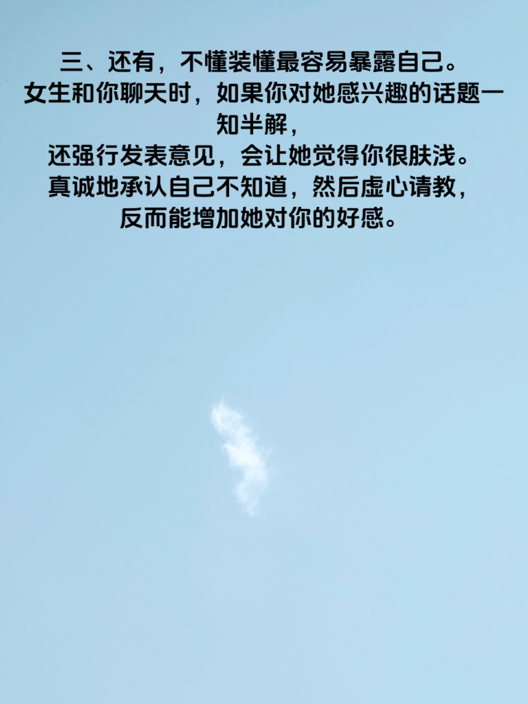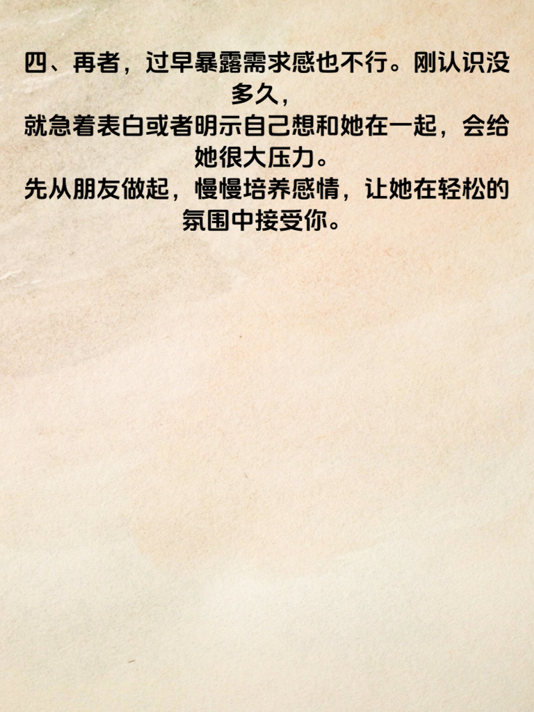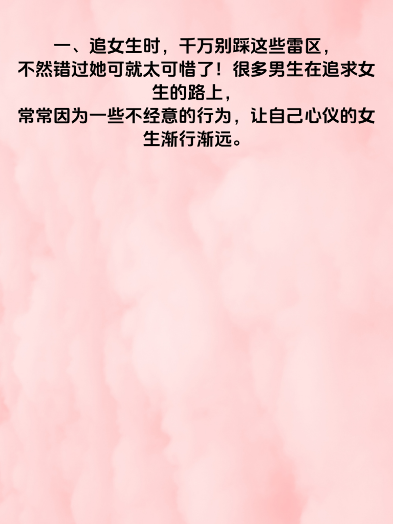 一、追女生时,千万别踩这些雷区,不然错过她可就太可惜了!很多男生在追求女生的路上,常常因为一些不经意的行为,让自己心仪的女生渐行渐远。 二、首先,过度纠缠是大忌。别一天到晚不停地给她发消息,轰炸她的生活。要学会把握好节奏,给彼此一些空间。比如,一天发一两条有趣的消息,分享点生活趣事,而不是长篇大论地表达思念。 三、还有,不懂装懂最容易暴露自己。女生和你聊天时,如果你对她感兴趣的话题一知半解,还强行发表意见,会让她觉得你很肤浅。真诚地承认自己不知道,然后虚心请教,反而能增加她对你的好感。 四、再者,过早暴露需求感也不行。刚认识没多久,就急着表白或者明示自己想和她在一起,会给她很大压力。先从朋友做起,慢慢培养感情,让她在轻松的氛围中接受你。 五、记住这些雷区,用心去追求,用对方法,才能让你离心仪的女生越来越近,收获美好的爱情。
