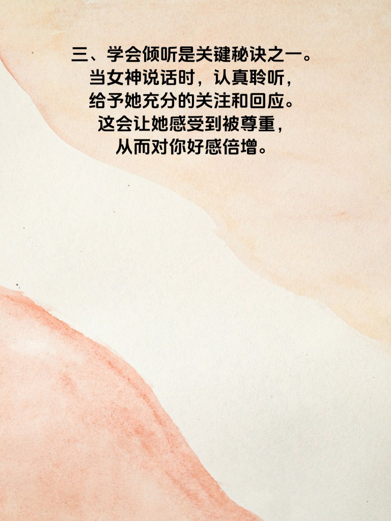 一、想要吸引女神,首先得有真诚且独特的自我。别去刻意伪装,展现真实的自己,包括优点与小缺点。因为真诚是打开她心门的第一把钥匙。 二、提升自身魅力至关重要。这不仅是外在的穿着打扮要得体、整洁,更在于内在修养。多读书、培养兴趣爱好,让自己拥有丰富的内涵,这样能在交流中散发出独特魅力。 三、学会倾听是关键秘诀之一。当女神说话时,认真聆听,给予她充分的关注和回应。这会让她感受到被尊重,从而对你好感倍增。 四、制造一些不经意的小惊喜。不需要多贵重的礼物,一份亲手制作的小点心,或是一次特别的散步安排,都能让她心里泛起甜蜜涟漪。 五、保持自信的姿态。相信自己的价值,在她面前展现出积极向上的态度。自信的男人,在女神眼中自带光芒,极具吸引力。