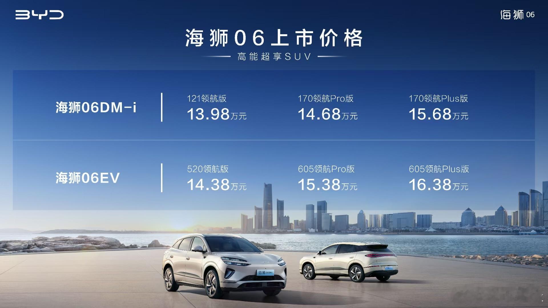 不同凡享比亚迪海洋网海狮06中型SUV今天在北京上市,分为插电混动和纯电版双车