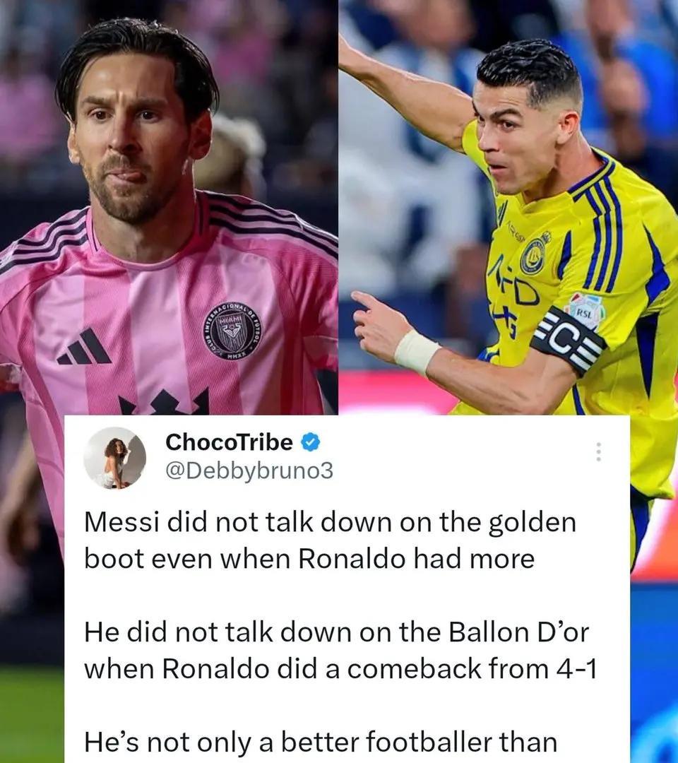 当C罗的欧洲金靴奖比梅西更多时,梅西不会贬低金靴奖。 当C罗从1:4的金球奖比分中追赶时,梅西不会贬低金球奖。 梅西不仅是比C罗更好的足球运动员,他还是一个更好的人。