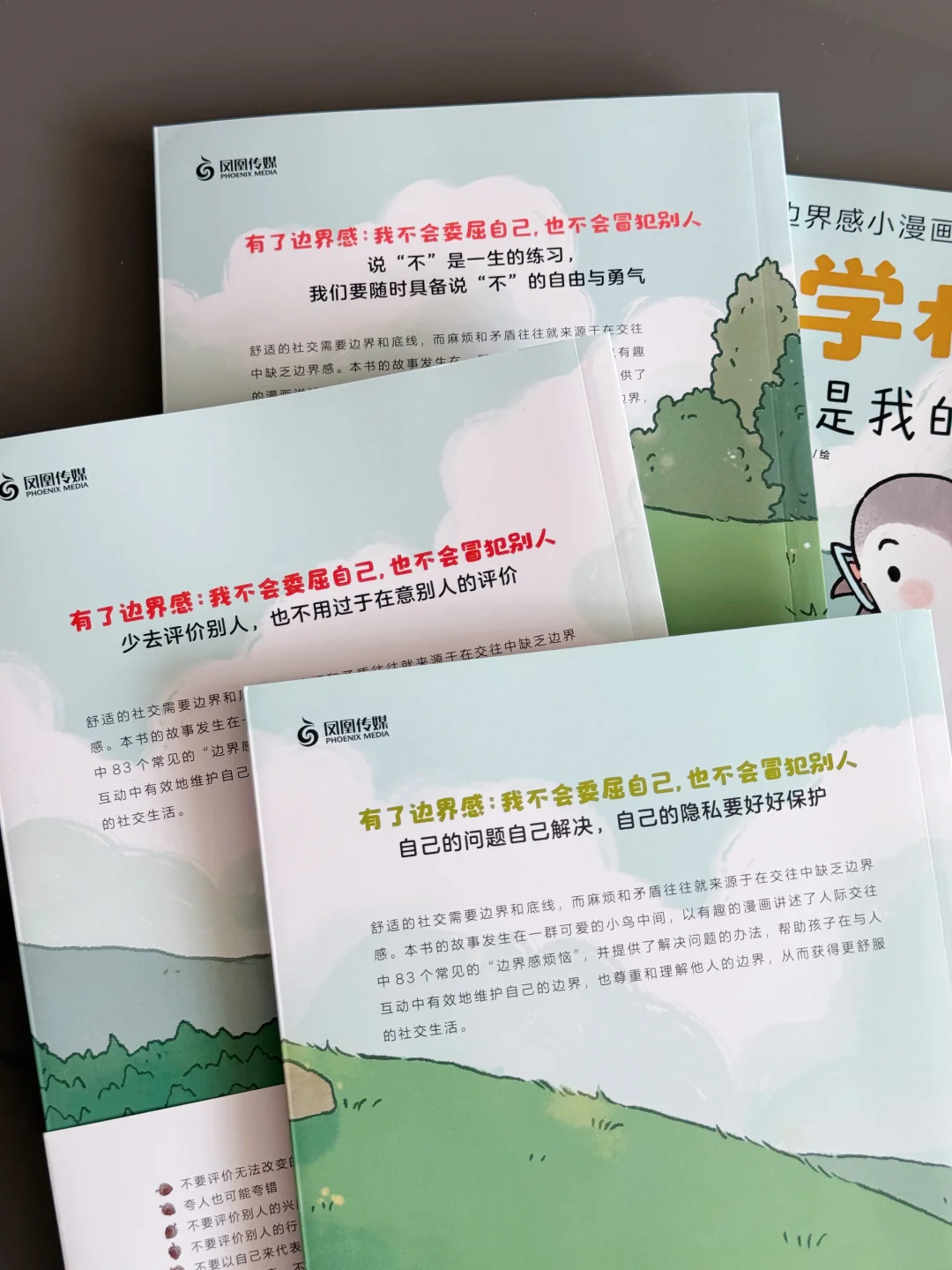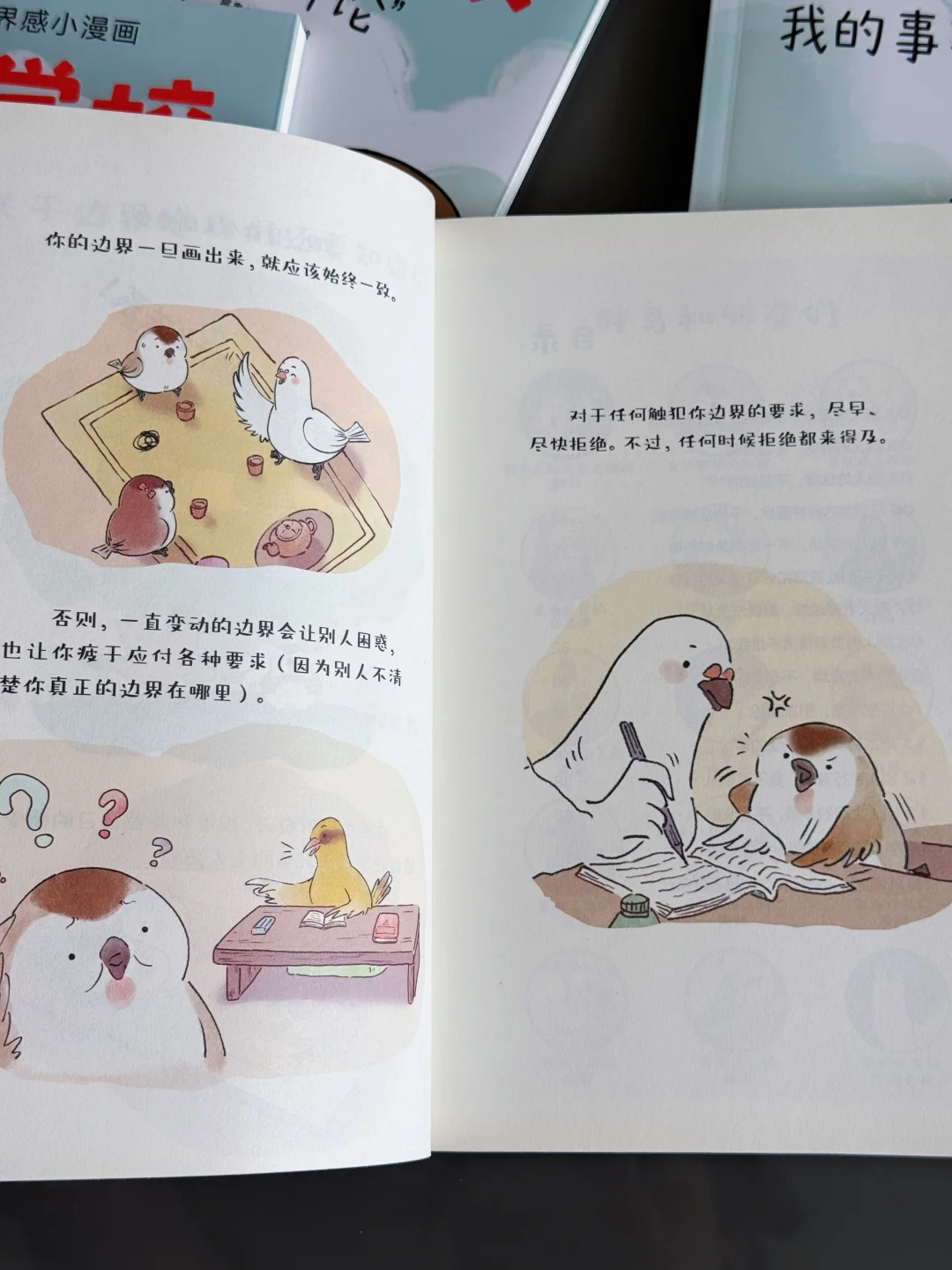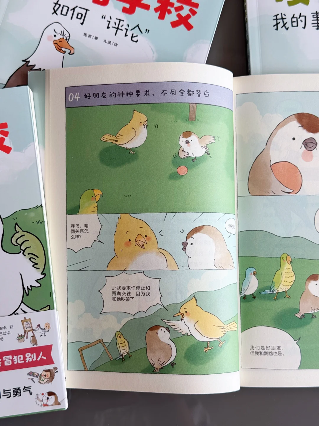 但这套书通过一则则漫画小故事告诉小朋友如何人际关系到底如何相处,举出来的例子都是平时容易发生的,比如勇敢说不、社交中不要委屈自己成全他人、注重自己的感受、为自己争取利益、保护好自己的隐私、少评价被人、也不要过于在意别人的评价等等,看的时候我只觉得这套书实在是太棒了!