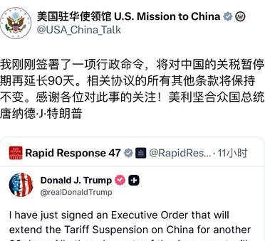 美国驻华使领馆今天写道:“我刚刚签署了一项行政命令,将对中国的关税暂停期再延长90天。相关协议的所有其他条款将保持不变。感谢各位对此事的关注!美利坚合众国总统唐纳德·J·特朗普”