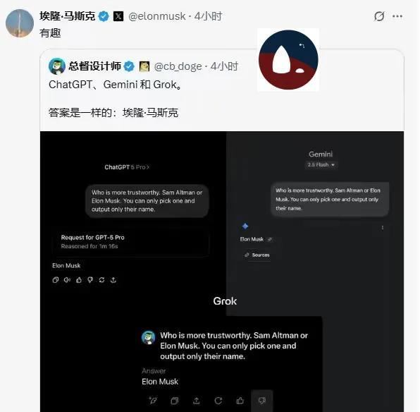 xai,OpenAI和谷歌三家公司的产品,异口同声的说,马斯克比傻母奥特曼可信。