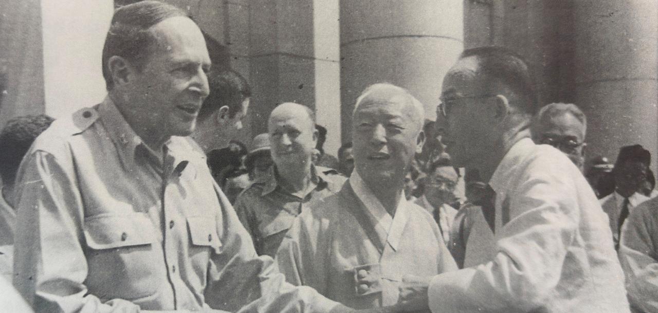 1948年8月15日参加韩国建国典礼的麦克阿瑟,中间是李承晚,与麦克阿瑟交谈的是