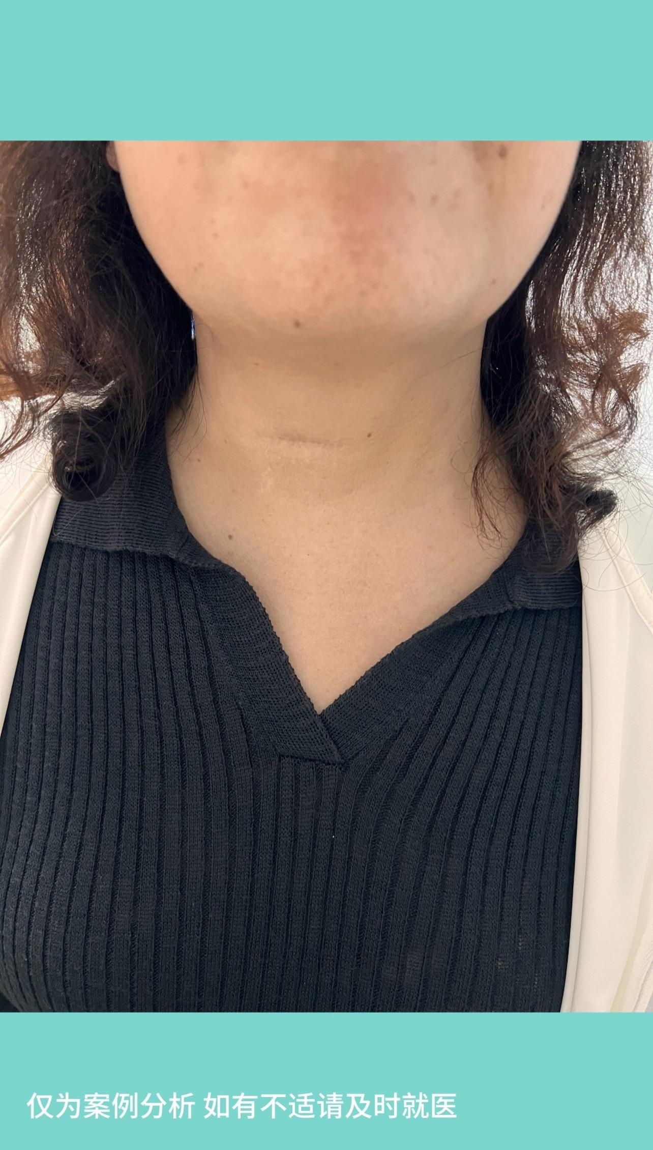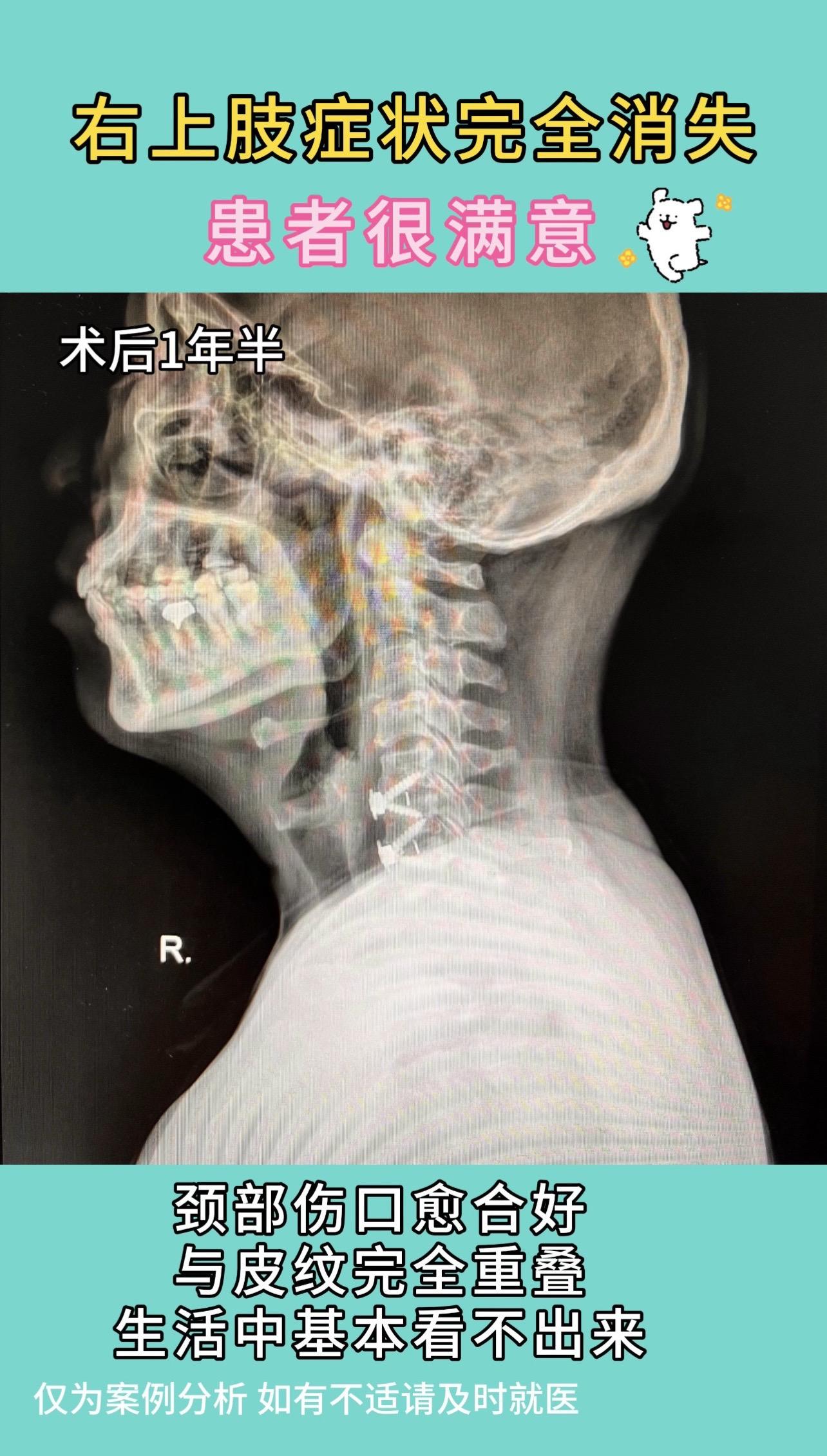50多岁女性,右上肢无力2月,刷牙不能,持筷不能。严重影响生活。术后1年半,右上肢症状完全消失,颈部伤口愈合好,与皮纹完全重叠,生活中基本看不出来,患者特别满意,也让我们医生充满了成就感。