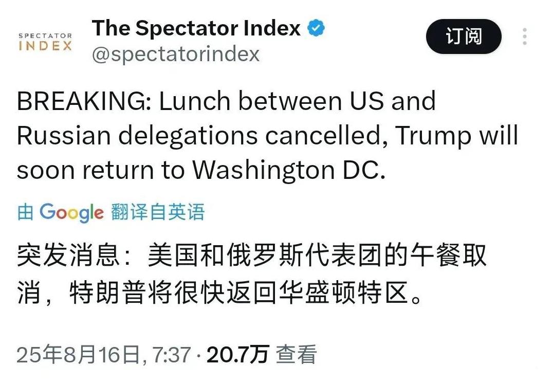 什么情况,饭都不吃就走? 美国阿拉斯加:原计划安排好的美俄代表团共进午餐节目被取消,美国总统特朗普在双方新闻发布会结束后将提前返回华盛顿,普京也是即刻离开阿拉斯加。 这么急,连一顿饭的功夫都不想多呆,是食不甘味还是怕夜长梦多?