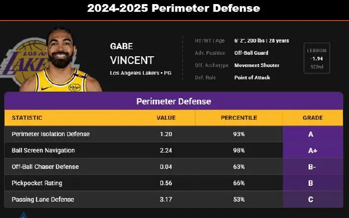 关于里夫斯的冷知识 他是目前湖人首发五人组防后卫最好的人,稍微思考一下就知道防守的问题关键不在他 顺便补充一下他和文总的防守对比,稍次一级。 Perimeter Isolation Defense:外线单打防守; Ball Screen Navigation:领防掩护; Off-Ball Chaser Defense:追无球掩护; Pickpocket Rating:抢断评级; Passing Lane Defense:传球路线防守(类似截断);