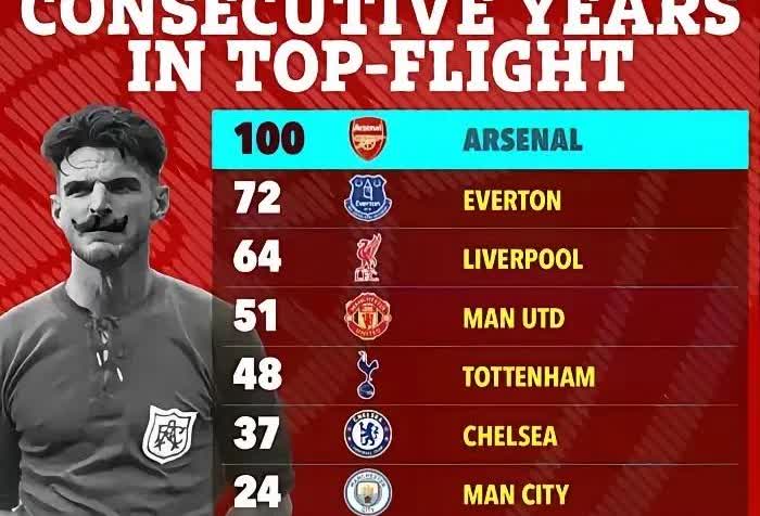 厉害呀,英超顶级联赛连续未降级俱乐部前5位排行榜: 1、第五位:热刺(连续48年未降级) 2、第四位:曼联(连续51年未降级) 3、第三位:利物浦(连续64年未降级) 4、第二位:埃弗顿(连续72年未降级) 5、第一位:阿森纳(连续100年未降级) 阿森纳真牛,是英超唯一一支保持百年在顶级联赛不被降级的俱乐部 如果再拿个欧冠回家那就更加完美了 联赛