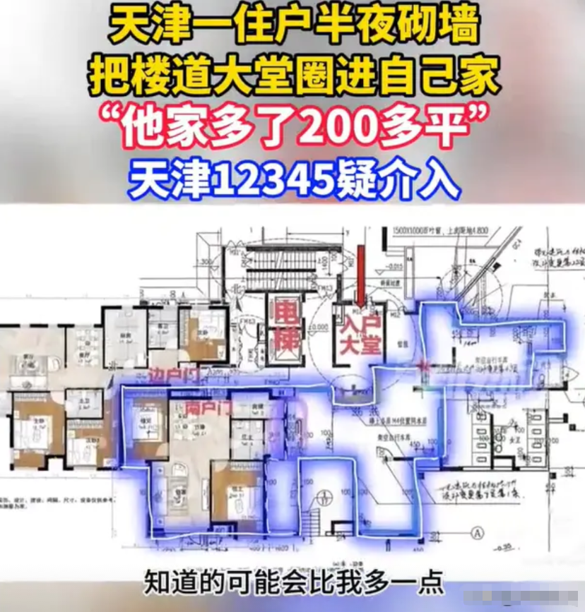 要问邻居此举意欲何为?很明显,他就是想要把大堂这边,给变成自己的“私人面积”,在私自装修之后,自己家的房子,一下子就多出了200多个平方。