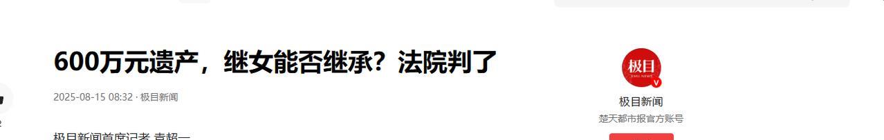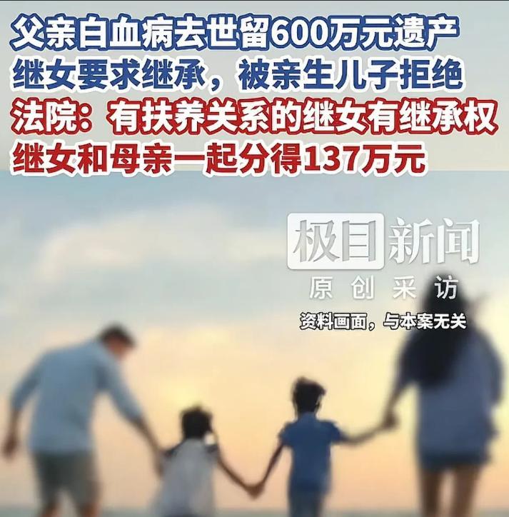 湖北黄石,男子娶了个二婚带娃妻子,十多年来将妻子的女儿视如己出,然而,10多年后男子突然离世,留下价值600多万的房产和存款。亲生儿子认为自己是老爸唯一的儿子,财产都应该由自己继承,可继母认为,自己作为妻子,自己的女儿作为养女,都有合法的继承权。双方反目成仇,法院的判决让人意想不到。 “我才是他唯一的儿子,你们说白了就是外人有什么资格继承遗产!”一男子在法庭上面咄咄逼人的说着。 根据8月14日的报道,程某(化名)与前妻因为感情不合,彼此之间总是因为一些鸡毛蒜皮的小事争吵,时间一长两人都对这段婚姻失去了希望。离婚后程某带着程小某生活,没过两年程某遇见了同样带着孩子的姚某。 两人相识相知,渐渐走到了一起,组建了新的家庭。程某是个善良且有责任心的人,尽管姚小某不是自己亲生,可他从一开始,就把这个小姑娘当作亲闺女看待。在姚小某的成长过程中尽心尽力的扮演着好父亲的角色。 不仅如此,程某还操心着姚小某未来的工作。四处托朋友、找关系,帮她联系实习单位,给她传授职场经验,希望她能少走弯路。 直到2024年夏天,程某被查出患有白血病。在程某病重期间,姚某和姚小某日夜守在病床前,悉心照顾。她们为程某擦拭身体、喂饭喂药,陪他聊天,但是在12月份程某最终还是离开了人世,留下了价值 600 多万的房产、存款以及股票基金等财产。 因为程某去世之前并未留下任何遗嘱,亲生儿子程小某认为程某的这些都应该由自己继承,毕竟自己才是程家血脉。姚小某和父亲没有血缘关系,凭什么来分自己家的财产,在他看来,姚小某母女就是外人。 姚某母女满心委屈,她们觉得程某在世时,对姚小某视如己出,这些年的付出大家都看在眼里。现在程某走了,却被程小某如此对待,实在难以接受。双方多次协商,都无法达成一致意见,最终,姚某母女一纸诉状,将程小某告上了法庭。 经过法庭的调查发现,这些年来,程某确实对姚小某照顾有加,就像亲闺女一样。程某经常关心姚小某的学习情况,积极参加家长会。同时,法院还调查了程某为姚小某支付学费、生活费等各项费用的银行流水记录。最终判定姚小某作为有抚养关系的继女,与程某的亲生儿子程小某享有同等的继承权。 经过法院的调解,双方态度缓和,姚某主动表示能保证基本生活就行。双方达成协议:姚某母女共分得 137 万元遗产,剩余部分归程小某所有。 案件结束后,网友们对此议论纷纷。有的网友说:“养恩大于生恩,程某养了姚小某十几年,倾注了那么多心血,姚小某理应得到遗产,法律的判决是公正的。” 也有网友表示:“虽然理解亲生儿子的想法,但既然父亲生前把继女当亲生女儿对待,就应该尊重父亲的意愿,亲情不应该被金钱打败。” 对于这件事情,你们怎么看?