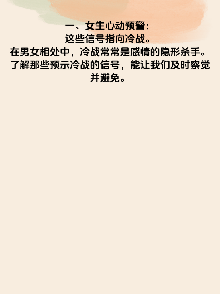 一、女生心动预警:这些信号指向冷战\n在男女相处中,冷战常常是感情的隐形杀手。了解那些预示冷战的信号,能让我们及时察觉并避免。\n 二、首先,突然的沉默寡言。当她原本活泼开朗,突然变得不爱说话,回复简短冷淡,这可能是冷战的前奏。也许是她在某件事上心里有了疙瘩,却没直接说出来。\n 三、其次,拒绝沟通。她开始回避和你面对面交流,对于你的询问总是敷衍了事。这表明她内心在抗拒,不想和你深入探讨问题。\n 四、再者,态度的明显转变。原本的温柔体贴消失,取而代之的是冷漠。她不再主动关心你,对你的事情也不再上心。\n 五、最后,频繁的小情绪。无缘无故地发脾气、生闷气,却又不说明原因。这其实是她在通过情绪传达内心的不满,只是在等待你主动发现问题,打破冷战的僵局。所以,男生们要敏锐捕捉这些信号,及时化解矛盾,让感情顺利前行。