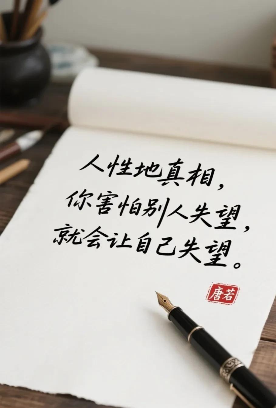 人性的真相:你怕别人失望,就会让自己失望。 有没有发现,人性的吊诡之处在于,当你把“不让别人失望”当作人生信条时,失望的深渊,往往最先吞噬你自己。 卡耐基曾说:“我们活在世上的光阴只有短短几十年,但我们却浪费了很多时间,为一些一年内就会被忘了的小事发愁。这是多么可怕的损失。” 想想看,多少“愁”与“虑”,是源于你怕父母失望、怕伴侣失望、怕朋友失望、怕领导失望? 怕失望,你就一次次咽下委屈; 怕失望,你就一次次透支自己; 怕失望,你就一次次模糊边界,让渡本该属于你的权利和快乐。 真实的人性很现实。 你怕朋友失望就借钱,结果自己捉襟见肘,对方未必感恩; 你怕领导失望就拼命加班,结果熬垮身体,升职未必轮到你; 你怕父母失望就违心选择,结果人生错位,他们未必真正满意…… 你小心翼翼维护着别人的期待,却亲手把自己推向了疲惫、焦虑、甚至怨恨的泥潭。最大的失望,往往是你对自己一次次妥协的积怨。 萨特说:“他人即地狱。” 这个“地狱”,有时并非他人主动施加,而是我们自己用“怕他失望”的锁链,将自己囚禁在他人目光的牢笼里。 你流连于他人的期待,不断调整自己的形状,最终迷失了自我。劳心劳力,只为成全一个“别人眼中的好人”,却把内心的平静与真实的渴望消耗殆尽。 学会“适度冷漠”,这不是无情,而是清醒。 你无法满足所有人,试图让所有人满意是注定失败的苦役。总有人会“失望”,这不是你的错。 别人的“失望”是他的课题和情绪,你无需也无力全盘负责。你的课题是过好自己的人生,问心无愧即可。 把自己的感受、健康和真实需求放在首位。只有你内心充盈稳定,才有能量真正惠及他人,而非带着牺牲感去付出。 温和而坚定地说“不”。守护自己的时间和精力,是对自己最大的负责,也是长久维系健康关系的基础。 真正的强大,不是活成别人期待的样子,而是有勇气活成自己本来的样子,并承担因此可能带来的“失望”。 与其在别人的期待中战战兢兢,不如在自己的世界里自在生风。 牢牢记住,你的人生剧本里,唯一需要取悦的观众,是你自己。 当你不再害怕“让别人失望”,你才能真正拥抱“让自己满意”的人生。#真正失望是什么# #看懂人性真相# #人性心理学#
