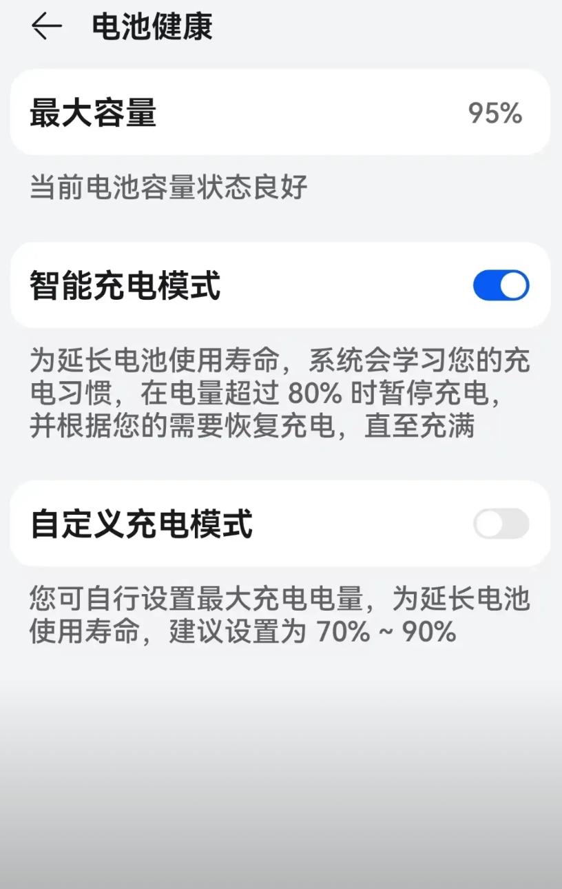 华为p70手机感觉掉电太快了! 我的华为p70手机去年买的,一年功夫,电池的最大容量已经95%了,而且感觉不是很耐用,一天不到就没电了,晚上待机的情况下能耗电十几个,还不如之前得nova5pro更耐用。 而老婆的p60手机已经使用2年了,电池的最大容量还是95%,所以综合对比感觉还是p60高通芯片的功耗控制更好。