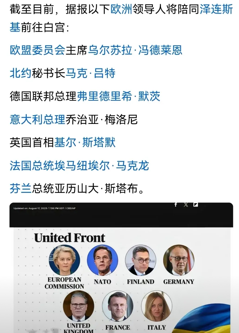 我虽然不是泽连斯基总统,但我也感到了一股强大的暖流,有这么多的欧洲政治精英(朋友)陪同他一起前往美国华盛顿。 北京时间明天,看看商人出身的美国总统特朗普是如何应对这些欧洲政治精英的,这些政治精英们说的话到底有多大的分量。 泽连斯基的态度肯定不会改变,一定还是坚持领土主张,不退让,但他会放下身段,强做微笑的表达。 最终欧洲这几位领导人也会把他们的关切点集中到如何确保乌克兰今后的安全这个上面来。 明天的两场,或者三场会谈,很有可能达成一个初步的意向:俄乌结束战争这个事儿可谈。 结束会谈以后,特朗普一定会给普京打电话通报会谈情况。 普京的反应如何,将是一个很重要的观察点。 这仍然会是一次没有任何协议的会谈。