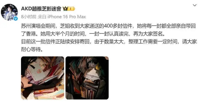 近日,赵雅芝影迷会透露,在苏州演唱会期间,赵雅芝收到粉丝送来的400多封信。她将信件全部带回香港,花了大半个月时间逐封认真阅读,随后签名,目前正陆续安排将信件寄回给粉丝。此前,赵雅芝还曾晒出这些信件,表示写信是她和粉丝几十年来保持的习惯。