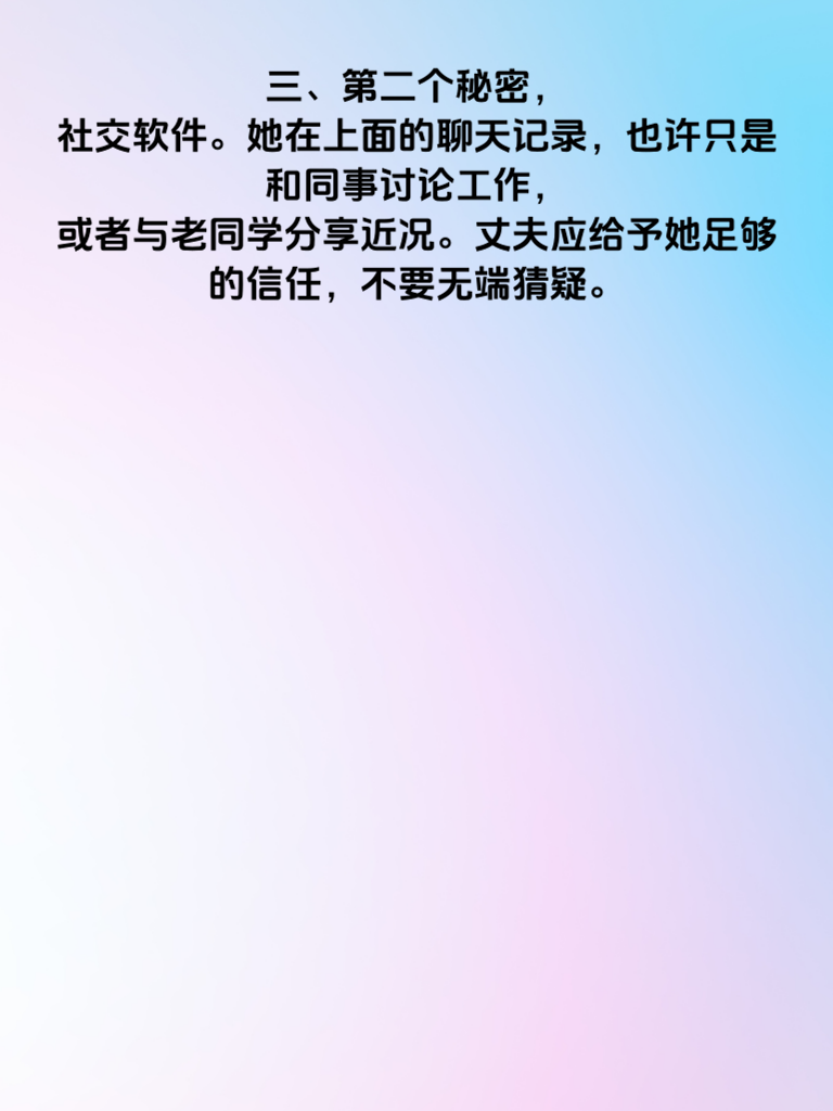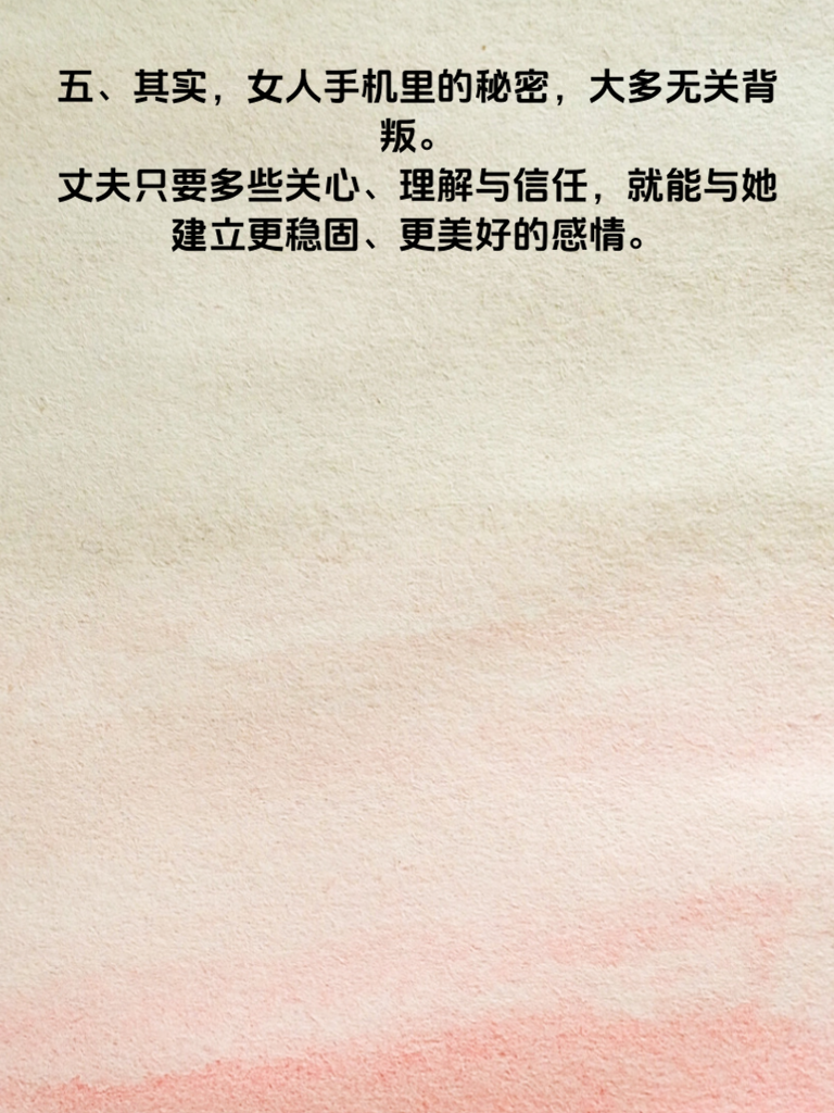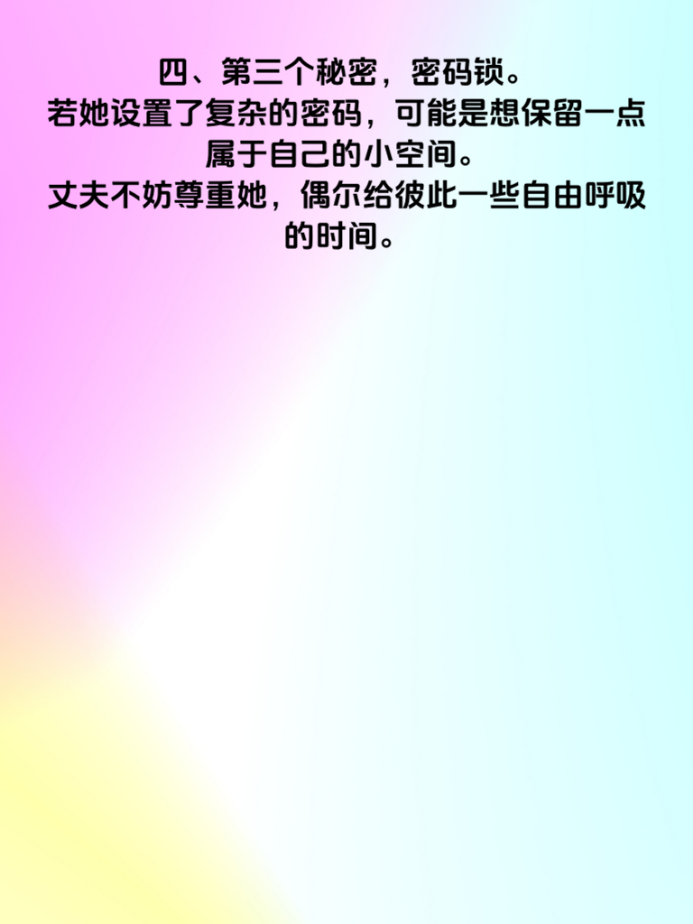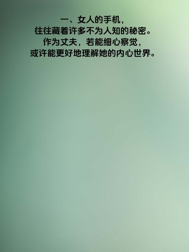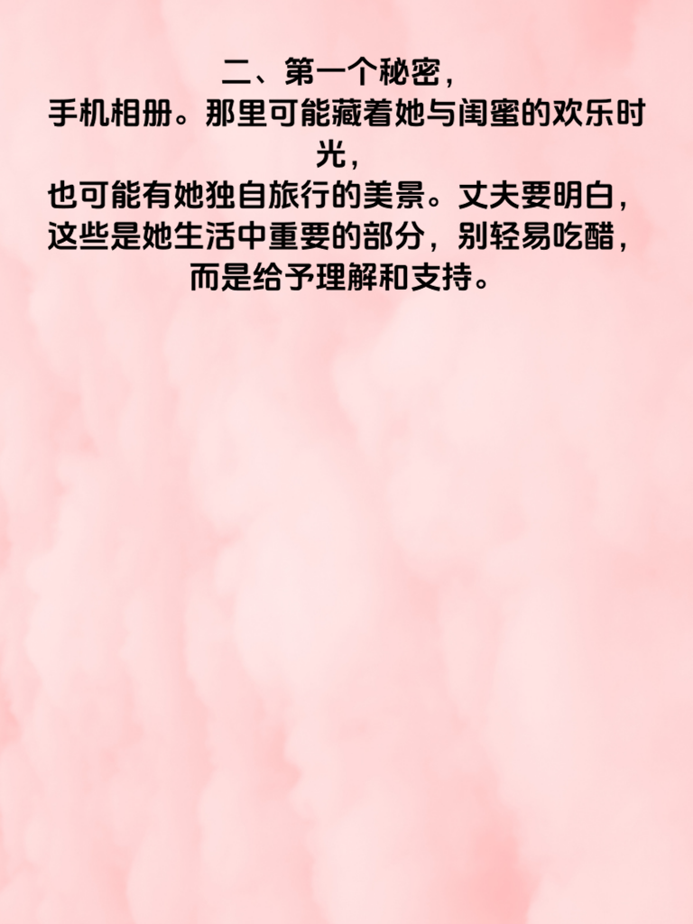 一、女人的手机,往往藏着许多不为人知的秘密。作为丈夫,若能细心察觉,或许能更好地理解她的内心世界。 二、第一个秘密,手机相册。那里可能藏着她与闺蜜的欢乐时光,也可能有她独自旅行的美景。丈夫要明白,这些是她生活中重要的部分,别轻易吃醋,而是给予理解和支持。 三、第二个秘密,社交软件。她在上面的聊天记录,也许只是和同事讨论工作,或者与老同学分享近况。丈夫应给予她足够的信任,不要无端猜疑。 四、第三个秘密,密码锁。若她设置了复杂的密码,可能是想保留一点属于自己的小空间。丈夫不妨尊重她,偶尔给彼此一些自由呼吸的时间。 五、其实,女人手机里的秘密,大多无关背叛。丈夫只要多些关心、理解与信任,就能与她建立更稳固、更美好的感情。