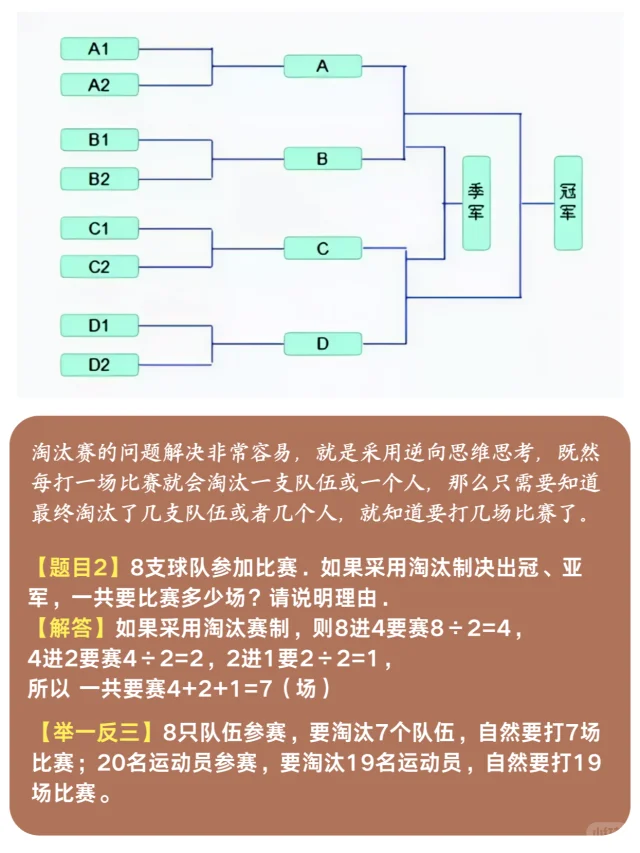 👉如果我们把参赛队伍数设为n,那淘汰队伍数就是n-1,总共比赛的场数也是n-1。