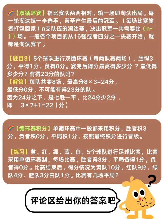 2️⃣双循环赛:是每支队伍之间都必须打两场比赛,一支队伍就会打(n-1)*2场比赛(就是打两次单循环赛),打的总场次就是n*(n-1)场比赛。