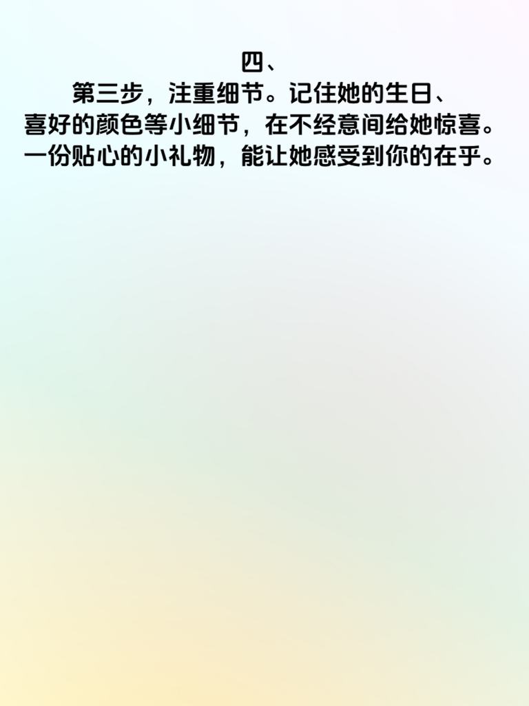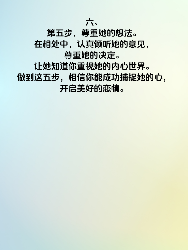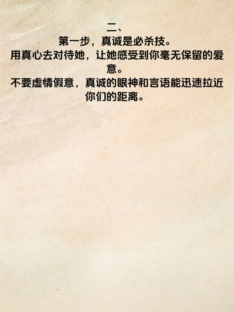 一、男人攻略:捕捉她的心,只需5步。追求女生,其实并不复杂,关键在于用心和掌握正确的方法。 二、第一步,真诚是必杀技。用真心去对待她,让她感受到你毫无保留的爱意。不要虚情假意,真诚的眼神和言语能迅速拉近你们的距离。 三、第二步,了解她的喜好。花时间去发现她的兴趣爱好,这样你们就有了更多共同话题。一起谈论她喜欢的事物,会让她觉得你很懂她。 四、第三步,注重细节。记住她的生日、喜好的颜色等小细节,在不经意间给她惊喜。一份贴心的小礼物,能让她感受到你的在乎。 五、第四步,保持适当的神秘感。不要一下子把自己所有的事情都交代清楚,偶尔展现出新的一面,让她对你始终充满好奇。 六、第五步,尊重她的想法。在相处中,认真倾听她的意见,尊重她的决定。让她知道你重视她的内心世界。做到这五步,相信你能成功捕捉她的心,开启美好的恋情。