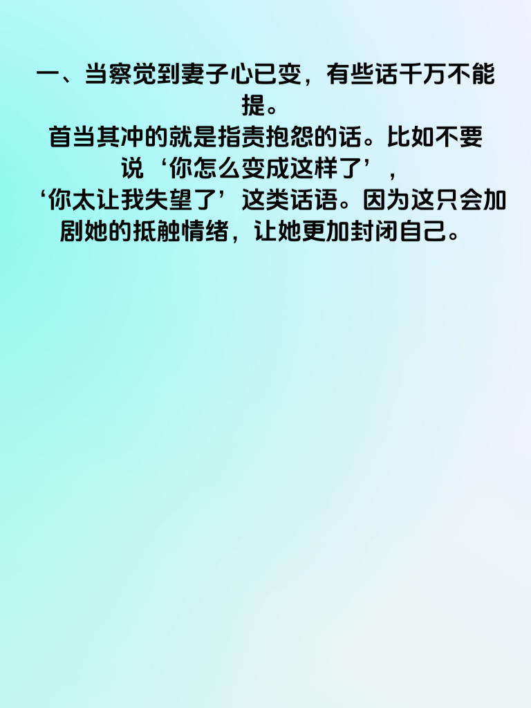 一、当察觉到妻子心已变,有些话千万不能提。首当其冲的就是指责抱怨的话。比如不要说