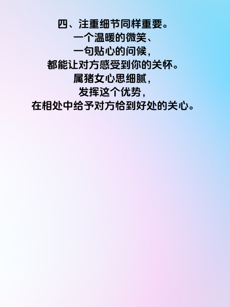 一、2025 年,对于属猪的女生来说,似乎有着特别的情感契机。红鸾星动,寓意着爱情的悄然降临。属猪女本就有着温柔善良的特质,在这一年,她们更容易吸引到那个对的人。 二、在追求爱情的道路上,属猪女要保持自信。相信自己的魅力,不要因为一些小缺点而妄自菲薄。展现出真实的自己,真诚永远是打动人心的法宝。 三、主动出击也是关键。不要总是等待爱情的降临,勇敢地去认识新的人。参加一些社交活动,拓展自己的社交圈,说不定那个让你心动的他就在某个角落等着你。 四、注重细节同样重要。一个温暖的微笑、一句贴心的问候,都能让对方感受到你的关怀。属猪女心思细腻,发挥这个优势,在相处中给予对方恰到好处的关心。 五、2025 年,属猪女们要抓住红鸾星动的机会,用自己的方式去追求爱情。愿每一个属猪女都能收获属于自己的甜蜜爱情。