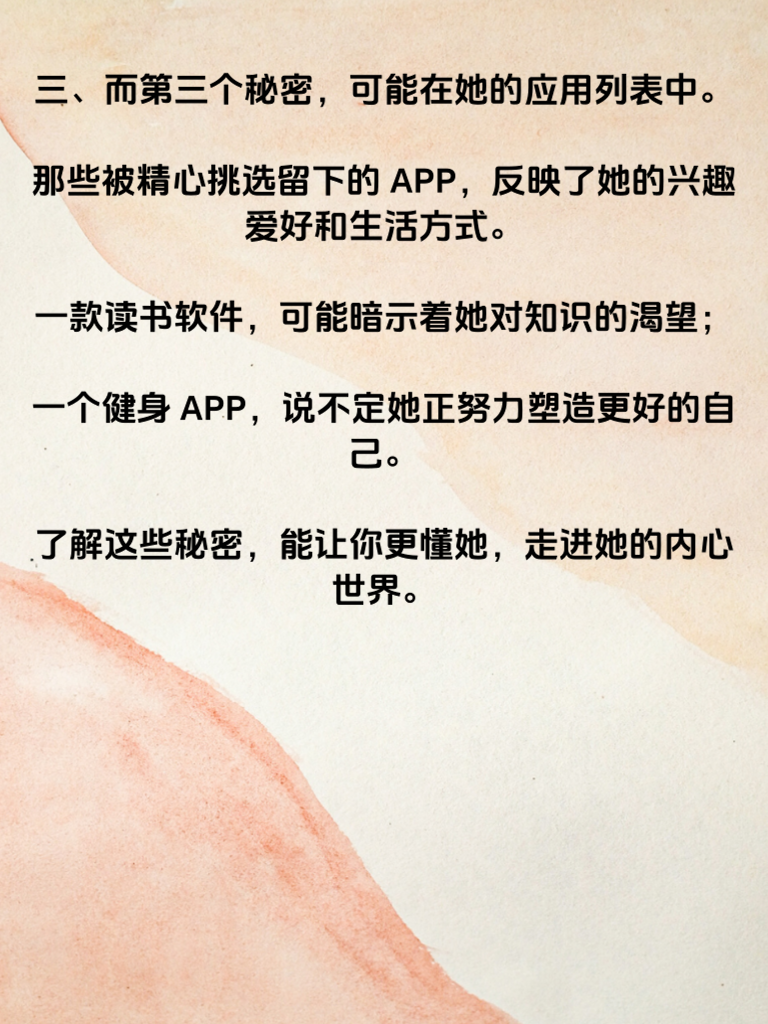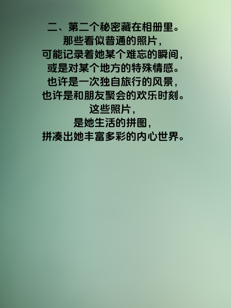 一、女人的手机,往往藏着许多不为人知的秘密。这其中,第一个秘密或许与她的安全感有关。她会小心翼翼地守护着手机里某些特定的聊天记录,那可能是和闺蜜分享的心事,也可能是与家人温暖的交流。这些内容,是她内心柔软角落的避风港,只有在绝对信任的人面前,才会偶尔展现。 二、第二个秘密藏在相册里。那些看似普通的照片,可能记录着她某个难忘的瞬间,或是对某个地方的特殊情感。也许是一次独自旅行的风景,也许是和朋友聚会的欢乐时刻。这些照片,是她生活的拼图,拼凑出她丰富多彩的内心世界。 三、而第三个秘密,可能在她的应用列表中。那些被精心挑选留下的APP,反映了她的兴趣爱好和生活方式。一款读书软件,可能暗示着她对知识的渴望;一个健身APP,说不定她正努力塑造更好的自己。了解这些秘密,能让你更懂她,走进她的内心世界。
