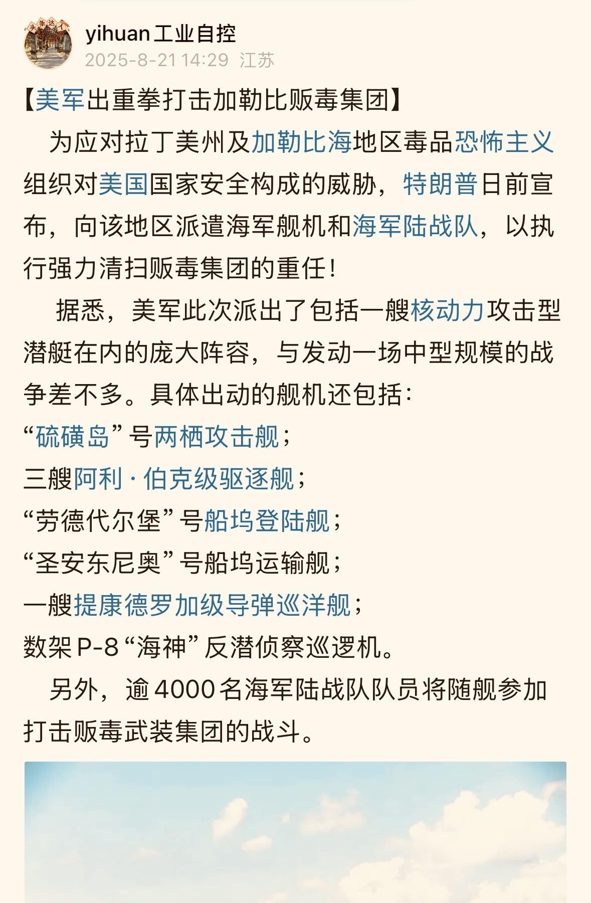 【委内瑞拉开展大规模民兵征召活动】 委内瑞拉总统马杜罗20日发表讲话,强烈谴责美国以打击贩毒集团为幌子,向委内瑞拉附近的加勒比海域派遣一支两栖作战中队和三艘军舰。马杜罗称美国此举违反了国际法和联合国宪章,要求美方立即停止破坏加勒比国家稳定和领土完整的行为。 美媒报道称,三艘美军战舰最快将于24日抵达委内瑞拉海岸附近,这些登陆艇和战舰上载有4500名军人,其中包括2200名美军海军陆战队队员。 鉴于美军这次来势汹汹,马杜罗宣布在全国紧急开展玻利瓦尔民兵登记征召工作,他呼吁所有爱国者加入“国家主权保卫计划”。 马杜罗对民众发表讲话时称,作为总司令,我认为在周六、周日立即开展大规模征召运动非常必要且及时,召集全国所有民兵、预备役军人及所有愿意挺身而出保家卫国的男女公民,对付美帝国主义,这已经绰绰有余了!马杜罗的全民皆兵路线,美国人应该会有所顾忌。