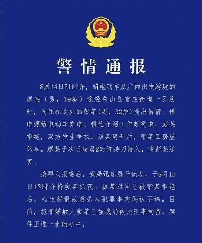 嚣张至极!2025年8月17日,重庆公安局警情通报,19岁的廖某因借宿被拒心生怨恨杀人,确定人死后竟还能淡定吃面条,睡大觉! 8月14日晚九点,骑着电动车自驾游的廖某来到了秀山县的一座民房,他看到了32岁的彭先生。 又累又渴的廖某像看到了救命稻草,他开口就向彭先生借宿、借电动车充电器,同时还希望彭先生能给他介绍一份工作。 作为员工的彭先生哪里遇到过这阵仗,或许是出于安全的考虑,又或者是其他什么原因,他拒绝了廖某的诉求,且说明了自己也是员工,做不了主。 可廖某才不管这些,就因为被拒,他心生怨恨,当即和彭先生吵了起来,彭先生坚守选择,始终没有松口。 廖某无奈,只得耷拉脑袋走了,而彭先生也去休息了。 此事到这,按说除心情不美丽外,也就到此为止了。 可廖某不是,他等到了凌晨2点,然后拿着刀潜入了彭先生的宿舍。 看到只有彭先生一人,他推门而入,拿着刀子照着彭先生就捅了过去,不一会,32岁的彭先生就彻底不动了。 得逞的廖某本要离开的,但在经过厨房门口时,发现门没有锁,饿了好几天的他顺势就进了厨房,给自己煮了面,拿锅端到二楼找到了一间没人的屋子吃了起来。 吃饱喝足,廖某困了,他没挪地方就呼呼大睡起来。 8月15日,做饭女子像往常一样来到公司厨房,准备给工人们做饭。 一进厨房她就傻眼了,刀和锅都不见了,直到这时她才想起来,没有见到工人彭先生。 此时隔壁的邻居进门找女子说话,他告诉女子,昨晚三点多听到屋里有动静,他以为是小偷,还起来看了,发现门锁着好着呢,就没多想,回家继续睡觉了。 女子听得越来越不对劲,再想到丢失的刀和锅,她拿出手机一边给彭先生打电话,一边往彭先生宿舍房门口走。 结果,电话在二楼响了起来,她也看到了斑斑血迹。 种种异常的情况,吓得女子赶紧报了警。 警方迅速来到了现场,先查看彭先生的情况,推门而入后,只见彭先生倒在了血泊中,已死多时。 他们想到了手机,在上二楼搜手机的时候,发现了意外之喜,那就是呼呼大睡的廖某。 此时已经是8月15日中午1点,廖某睡得还没有起来。 他的旁边赫然就是丢失的刀和锅,看到这,不禁让人感叹,这人得心大到什么程度,杀了人竟然还能睡着?到底该说他是年少无知呢?还是说他丧心病狂? 不知廖某的亲人看到他如此恶魔的一面,又该作何感想。 相比于廖某,彭先生更令人意难平,他就是家里的顶梁柱,在重庆秀山县的门窗公司上班,一个月能挣7000元。 他的妻子带着8岁的儿子和3岁的女儿在老家生活。 如今彭先生因为拒绝借宿就被杀害,可谓是无妄之灾,因着他的离开,一个家也碎了。 廖某对自己所做供认不讳,可从他能淡定吃面,淡定睡觉的行为来看,他丝毫没有悔过之心。 从警方的通报中,案件已经非常明了,廖某已经依法刑事拘留,而且他也已经年满18周岁了,会被重判到“一命还一命”那样吗? 资料来源: 大江网《“重庆19岁男子借宿被拒杀人”,凶手作案后淡定煮面,睡大觉》 作者:巧