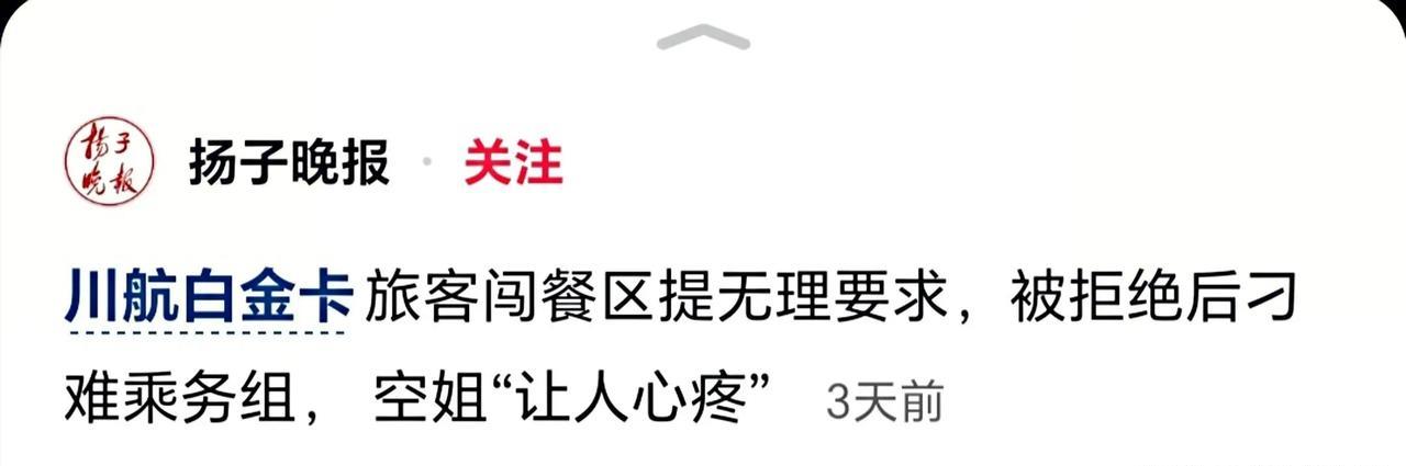 说白了 仗着自己的里程和消费 刁难空姐 估计是个惯犯 [捂脸哭][捂脸哭][捂脸哭]其实很简单 空姐也是人 也值得旅客尊重