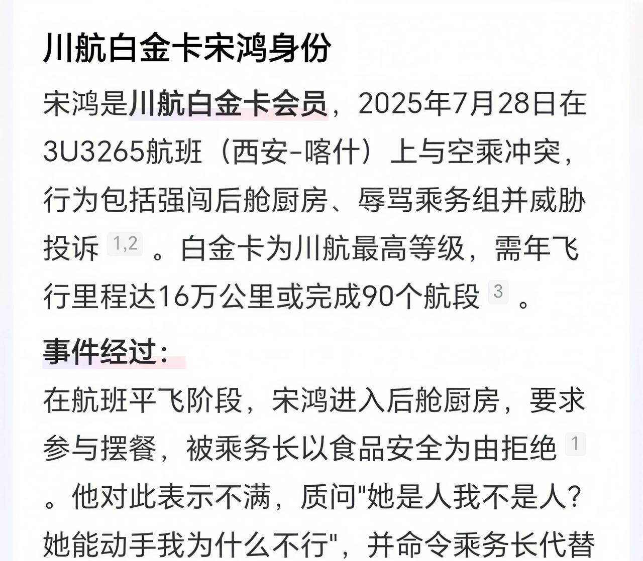 川航白金卡宋某原来是个惯犯啊? 疑似他朋友圈被扒 飞三天投诉仨人,戴着眼镜看着文质彬彬,但做的事却不敢让人恭维啊! 而被宋某刁难的川航乘务员,看着让人心疼,在白金卡客户面前,显得是如此卑微,明知是被刁难,还不敢反驳,说话更是不敢提高声调! 虽然事后川航说乘务员所做的都是符合规定,但对持白金卡的乘客,宋某却没有进一步的处罚!宋某当时的行为难道不是扰乱治安吗?难道因为他是白金卡客户,因为他经常乘坐飞机,这个大客户,就得包容嘛? 还有,这个持白金卡的宋某,心理是不是有问题呀?