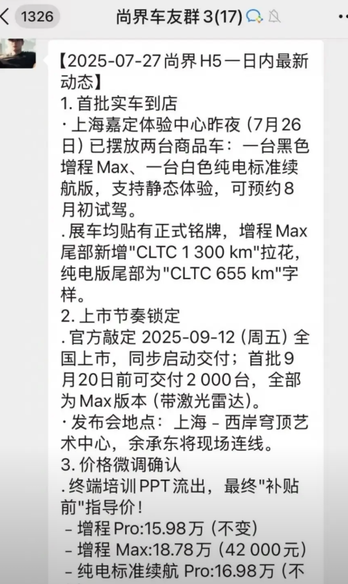 这是车友群曝光的指导价,值得一提的是,Max版本指导价后面括号有一个4.2万的标价,大概率是指车主想开通ADS4.0,需要额外支付这个钱。想一想就知道了,如果不是这样,那不到20万就有ADS4.0是不现实的,亏都亏惨了,别说把竞争对手打的满地找牙,可能先严重影响鸿蒙智行车型的销量,比如问界M5,问界M7,智界R7以及智界S7。