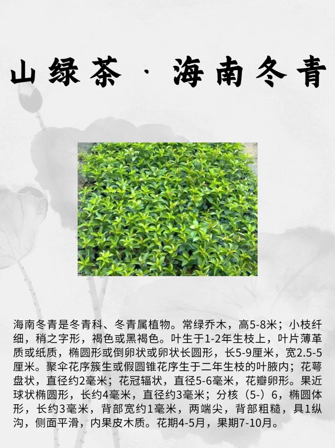每天认识一味中草药——【山绿茶】 山绿茶,中药名。 为冬青科冬青属植物海南冬青的叶。 生长环境:常生于中海拔的山地疏林和密林中。 产地分布:分布于我国广东、海南、广西等地。 性味归经:味苦、甘,性平。入肝、脾、肺、肾经。 功效:清热平肝,利咽解毒。高血压病,口疮,咽痛,痈疖肿毒。 禁忌:脾胃虚寒者。