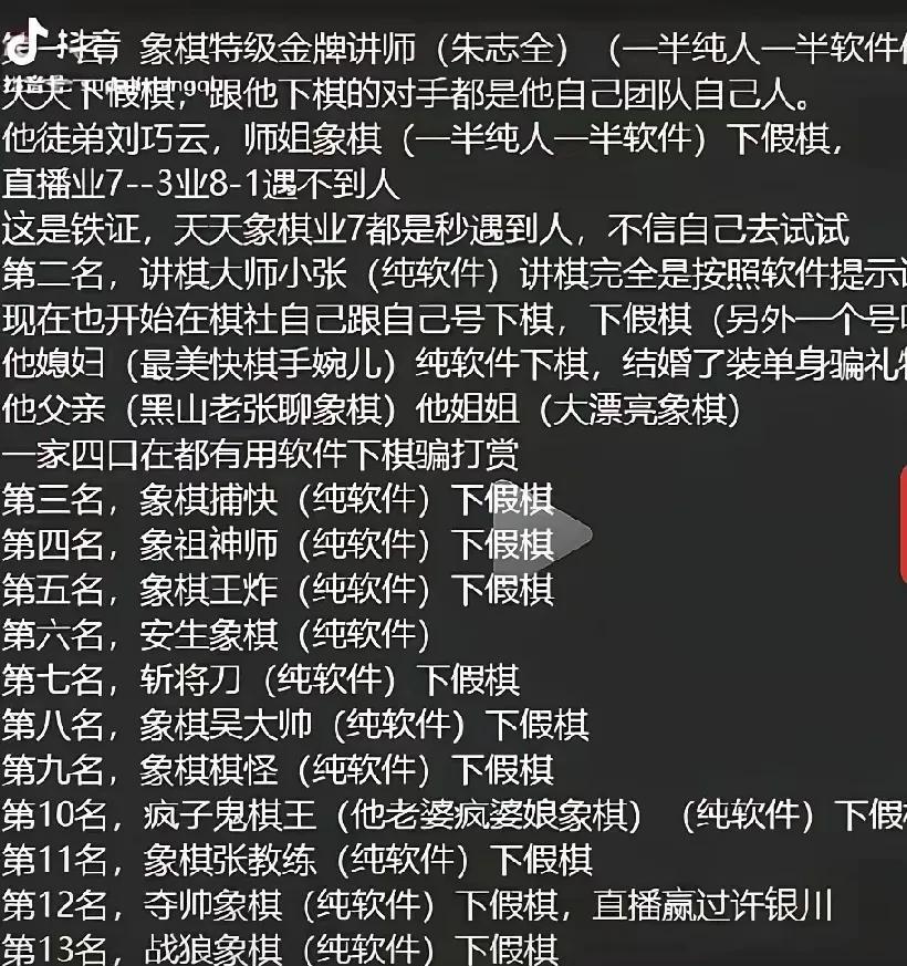 2025象棋不好下,你的对手可能是软件,仙女棋圣揭露软件象棋高手——真正的象棋砸锅人! 第一个叫朱志全,半人半软下假棋,徒弟会做咸蛋汤,叫刘巧云,不知道是不是说王天一在外边,相当安全那个人?也有可能重名重姓! 第二个叫小张,自己和自己下棋,这倒挺新鲜? 第三个叫捕快 第四个叫神师 第五个叫王炸 第六个叫安生 第七个叫斩将刀(风云雄霸天下被步惊云一招毙命的人) 第八个叫吴大帅 第九个叫棋怪 第十个叫鬼王 第11个叫张教练 第12个叫夺帅 第13个叫战狼 第14个叫阿豪 第15个叫大江 小结: 仙女棋圣为广大棋迷指点迷津,原来网络下棋,还能用软件,有意思吗? 王天一郑惟桐赵鑫鑫来了也下不过,许仙天天喊世外高人,原来如此! 象棋本是一场竞技 比的是棋艺,这倒好,软件欺负真人?这算不算砸锅象棋?搞得棋迷望而却步,只看不下了。。。。这些人为了一己私欲,伤害棋迷的热情与象棋的发展,太过分了! #头号创作者激励计划#