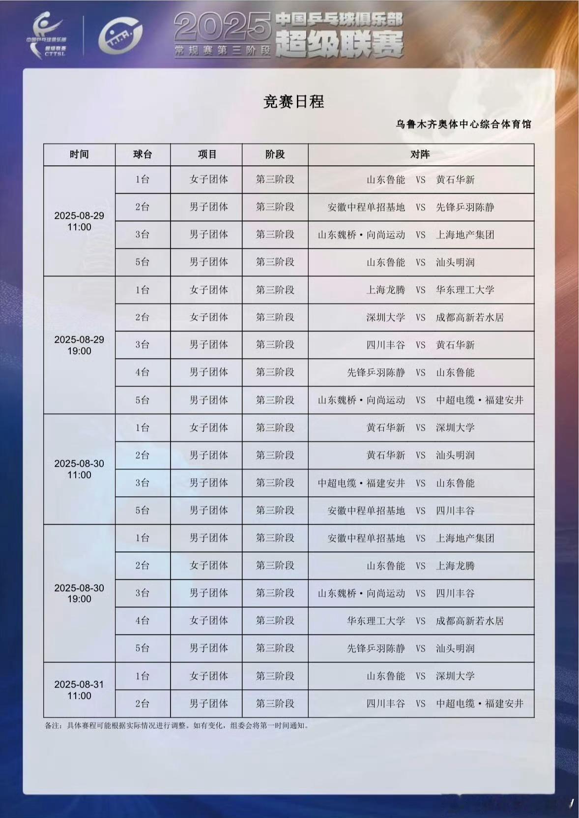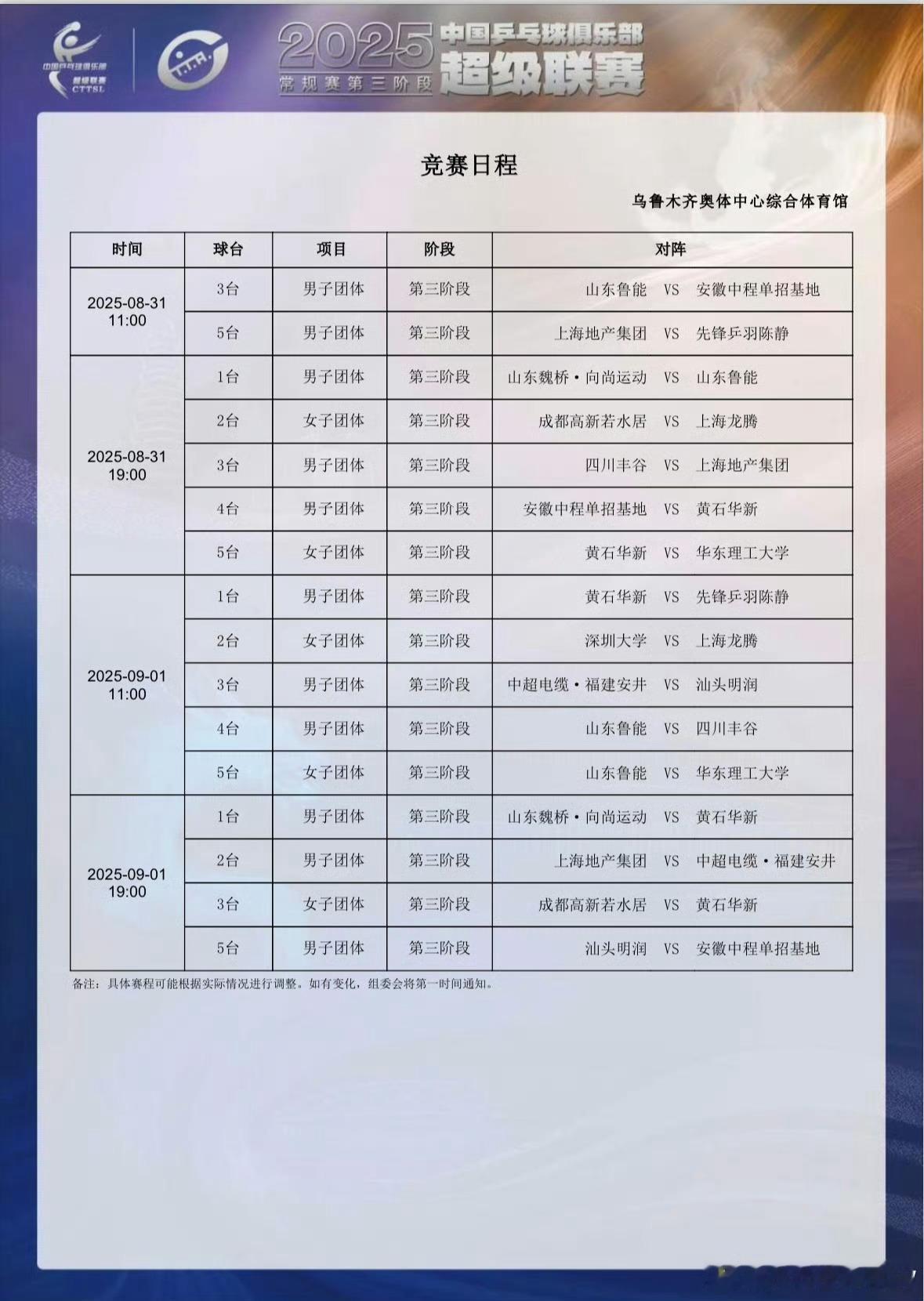 2025乒超联赛第三阶段竞赛日程表(带台号版)