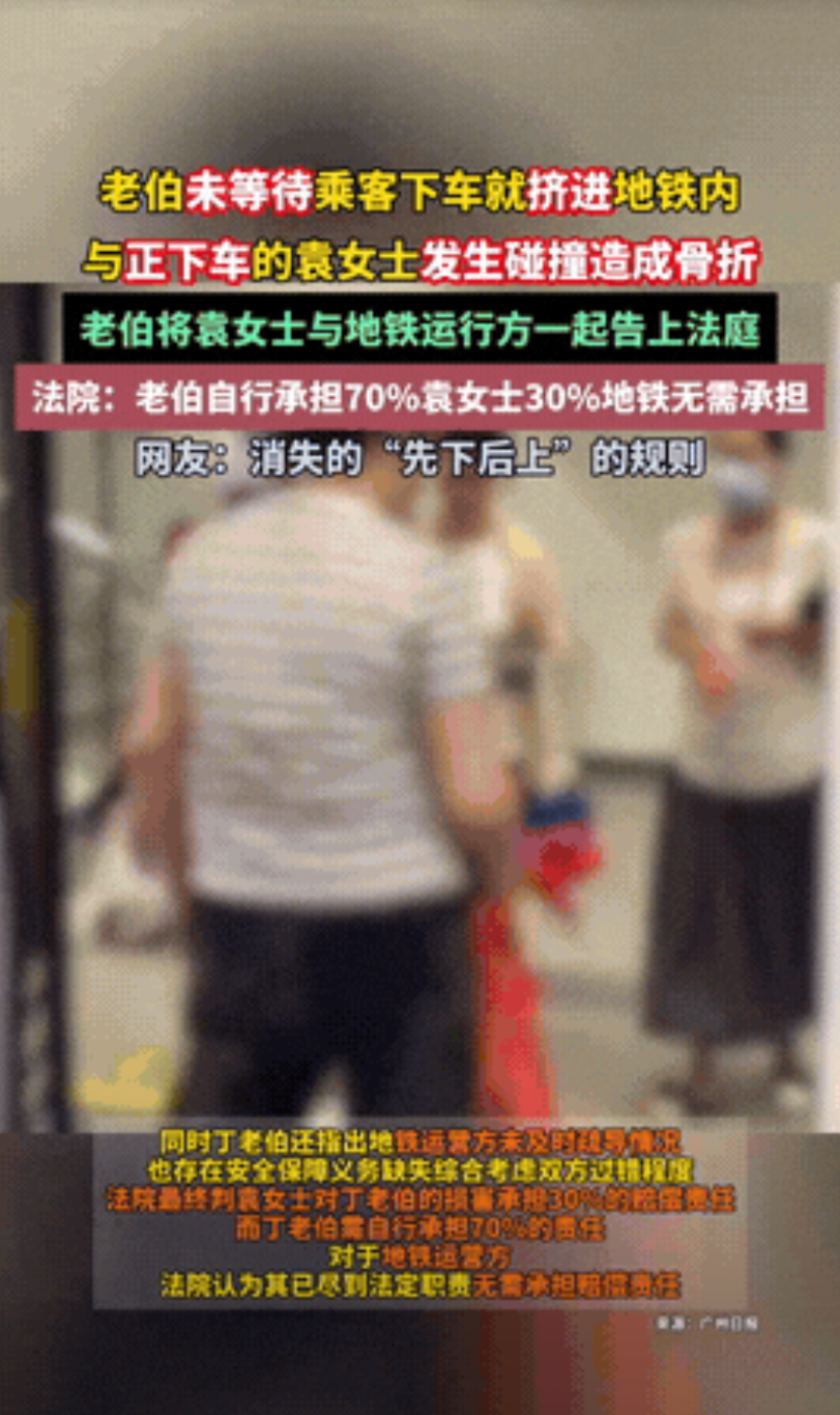 “没有规矩,不成方圆!”上海,一老大爷乘坐地铁,上车时还没等其他乘客下车,大爷就硬挤着要上,导致与一名下车的女乘客相撞,大爷摔倒导致十级伤残。事后大爷认为女子没有礼让他导致受伤,将女乘客和地铁运营方告上法院,索赔28.4万。法院判了! 8月26日,上海市第三中级人民法院对外公布了一起因为乘客未能遵守地铁规定而爆发的民事纠纷案件。 2023年11月14日上午,年近七旬的丁大爷与家人一同乘坐上海地铁8号线外出,事发当时,一家人正在地铁站台等候上车。 可能是因为老人不懂,等待地铁的时候,丁大爷并没有站在站台专门规划好的上车区域,反而是站在了乘客下车的区域,而他的家人对此也没有进行阻拦。 11时07分,地铁列车缓缓进站,随后地铁站台也开始播放语音通知,让上车的乘客先给下车乘客让位置,避免出现踩踏等意外事故。 车门打开后,几十名乘客从车厢内缓缓地走了出来,整个候车台都变得拥挤了起来。 就在乘客慢慢的下车的时候,丁大爷好像是担心这些下车的乘客耽误他上车一样,独自一人挤着下车的乘客想要登上地铁车厢。 因为当时现场非常拥挤,丁大爷这一举动瞬间让那些下车的乘客没反应过来,这也导致了下车的吴女士(化名)没看清楚丁大爷的身影,二人直接撞到了一起。 由于事发突然,丁大爷根本来不及做出反应,他的身体失去平衡,重重地摔倒在站台上。 吴女士在发现自己将丁大爷撞倒后,她也是迅速将丁大爷扶起,列车的工作人员发现后也是上前帮忙。 随后众人陪着丁大爷的家人一起将对方送入了附近的医院进行救治。 经过医院的诊断,丁大爷因为年纪较大,再加上遭到了巨大的外部冲击,最终被确诊为右股骨粗隆间骨折。 后续,经过专业的鉴定机构鉴定,丁大爷的伤情被认定为十级伤残,未来的生活可能面临诸多不便。 事故发生后,丁大爷及家属认为,吴女士在下车过程中没有尽到应有的注意义务,是导致丁大爷摔倒受伤的直接原因,因此吴女士应对丁大爷高达28.4万元的医疗费用等全部赔偿责任。 同时,丁大爷的家人还指责地铁运营方,认为其在站台管理过程中,没有及时有效地疏导人流,存在明显的安全保障义务缺失。 对于丁大爷一家对自己的指控,吴女士并不认同,她坚称自己是按照正常流程下车,在下车时也没有任何违规行为。 吴女士认为,丁大爷摔倒受伤,主要是因为丁大爷自己没有遵守“先下后上”的乘车规则,并且站在了错误的下车区域等待上车,这才导致了双方发生碰撞。 地铁运营方也表示说,在站台的各个关键位置,都设置了明显的指示标识,用来引导乘客正确候车和上下车,列车到站前地铁方也进行了广播提醒。 而且在事故发生后,地铁工作人员第一时间赶到现场进行救助,已经充分尽到了合理范围内的安全保障义务,不应该承担任何责任。 法院审理后表示,《上海市轨道交通乘客守则》也白纸黑字地规定,乘客必须在安全线内排队,遵循先下后上的原则,严禁强行上下车。 而事发地铁站的候车区域,地面设置有金属材质油漆标识,清晰明确地规范了上车和下车的等候区域。 丁大爷作为乘坐地铁出行的乘客,理应知晓并遵守这些基本规则。但在事发时,他却未站在规划的上车区域,导致与下车乘客形成对冲,这是事故发生的关键因素。 但考虑到丁大爷年纪较大,且查看监控发现,吴女士在下车时并未谨慎观察周围的人流状况,在一定程度上也存在疏忽。 综合多方面因素考虑,法院最终作出判决,吴女士对丁大爷的损害承担30%的赔偿责任,而丁大爷自己则需承担70%的责任,地铁运营方由于已经尽到法定职责,无需承担任何赔偿责任。 对此,大家又是如何看待的呢?