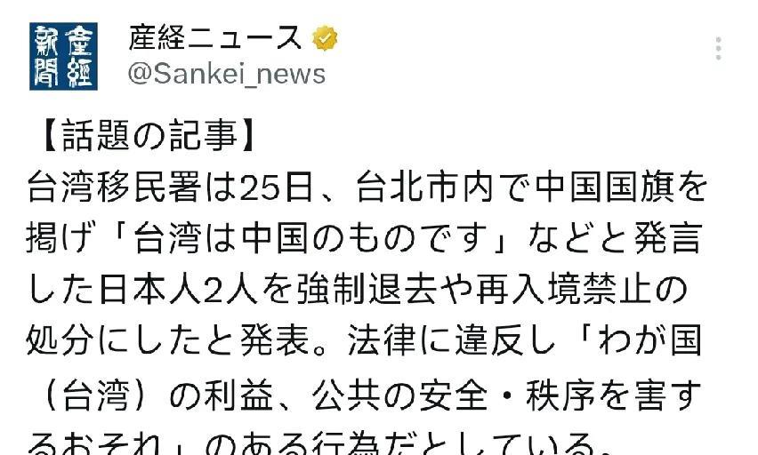 8月31日,日媒报道:“台移民署本周宣布,已将两名在台北悬挂中国国旗并发表‘台湾属于中国’言论的日本国民驱逐出境并禁止入境,移民署表示,该行为违反法律,可能损害公共安全利益及秩序。”