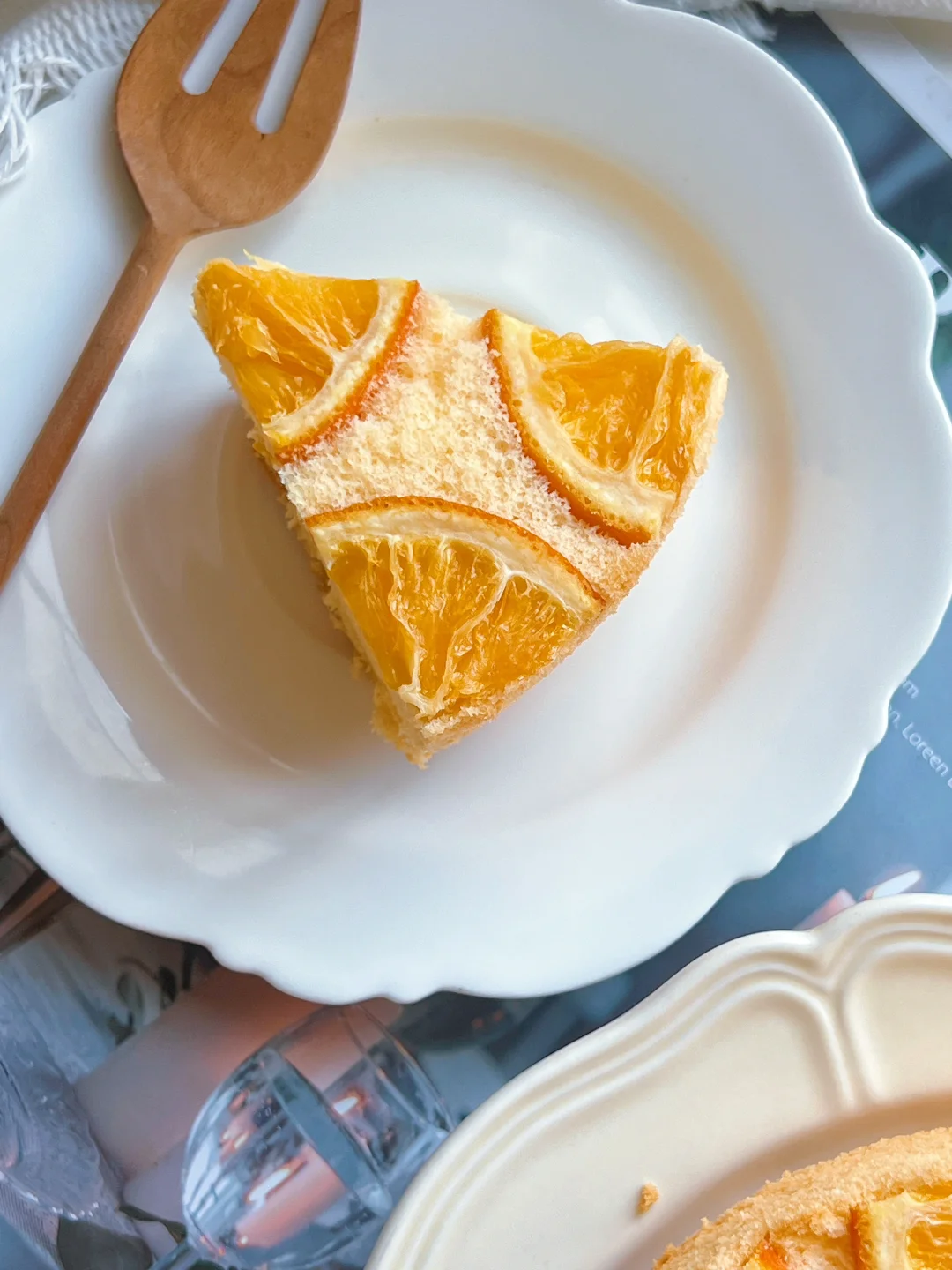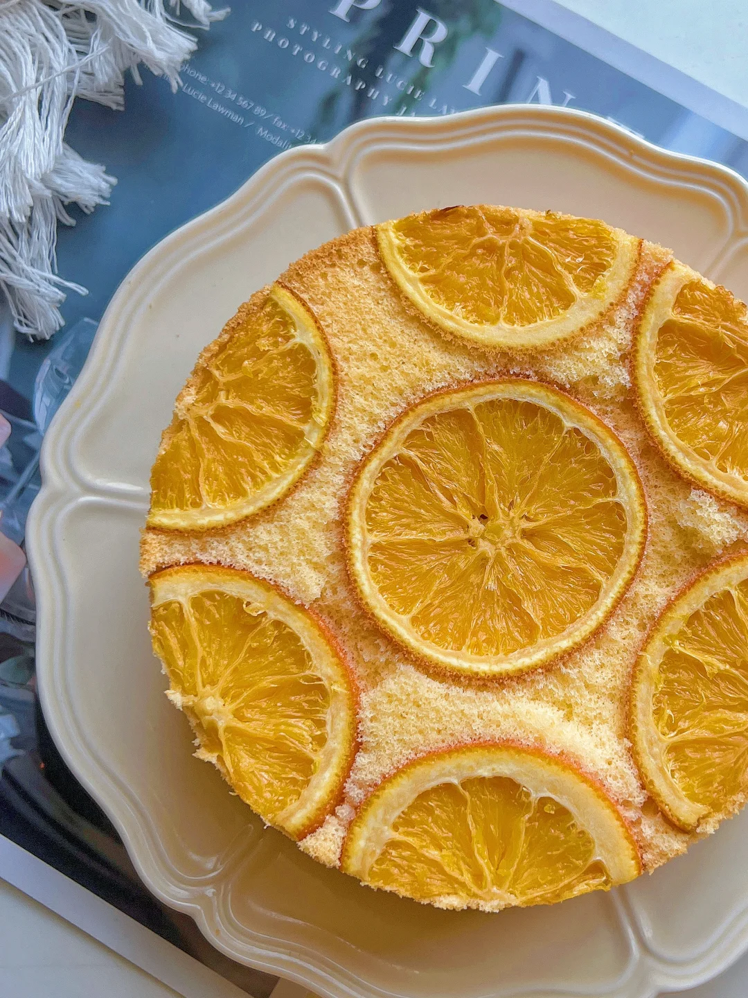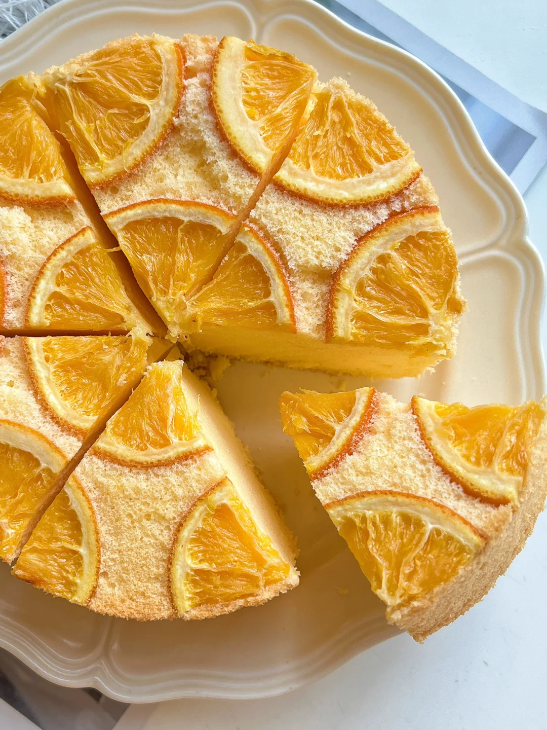 9️⃣从高处倒入放好糖渍橙子片的戚风模具,震几次震出大气泡,放入烤箱下层上下火130度60分钟,转150度10分钟(可以看上色情况盖锡箔纸)